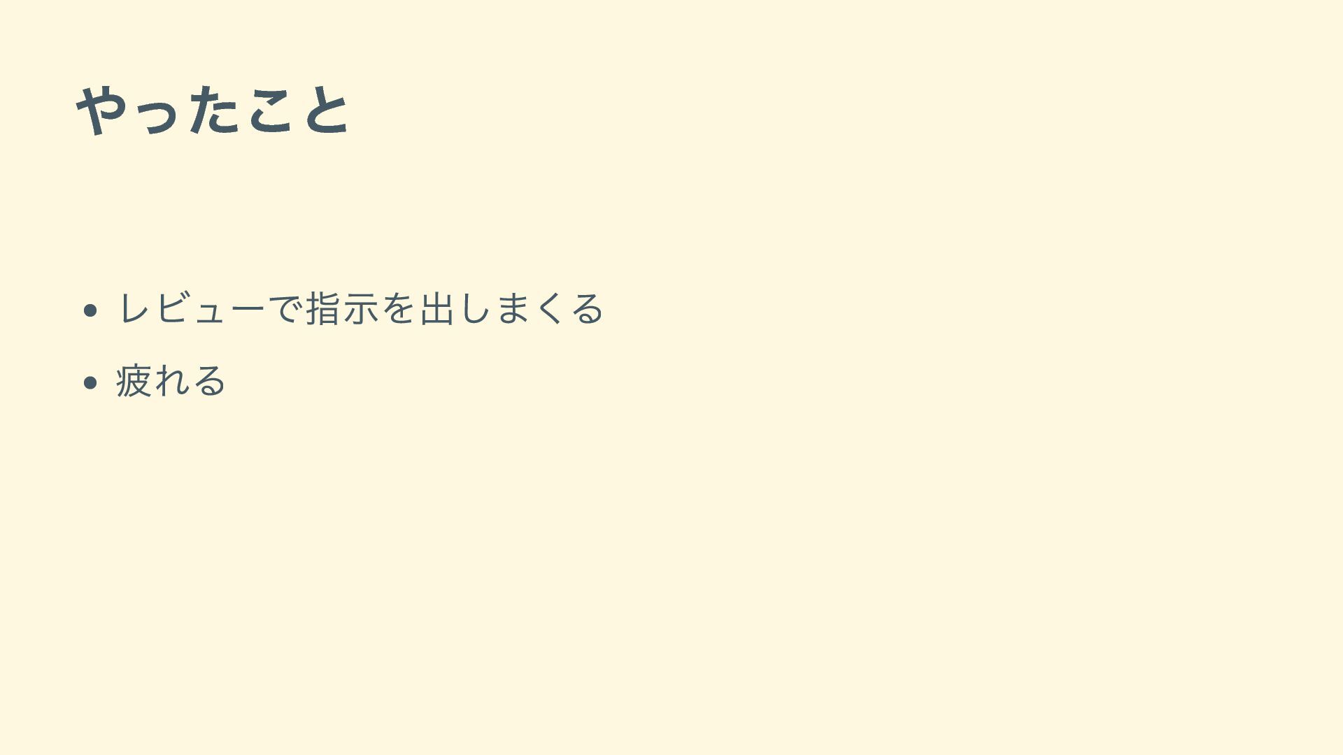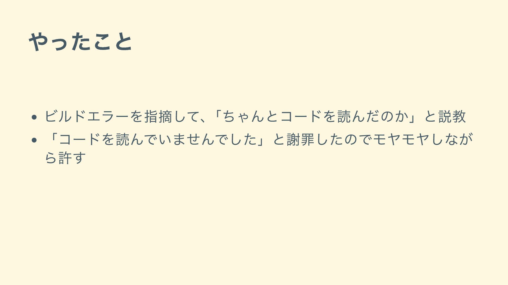 やったこと ビルドエラーを指摘して、 「ちゃんとコードを読んだのか」と説教 「コードを読んでいませんでした」と謝罪したのでモヤモヤしなが ら許す