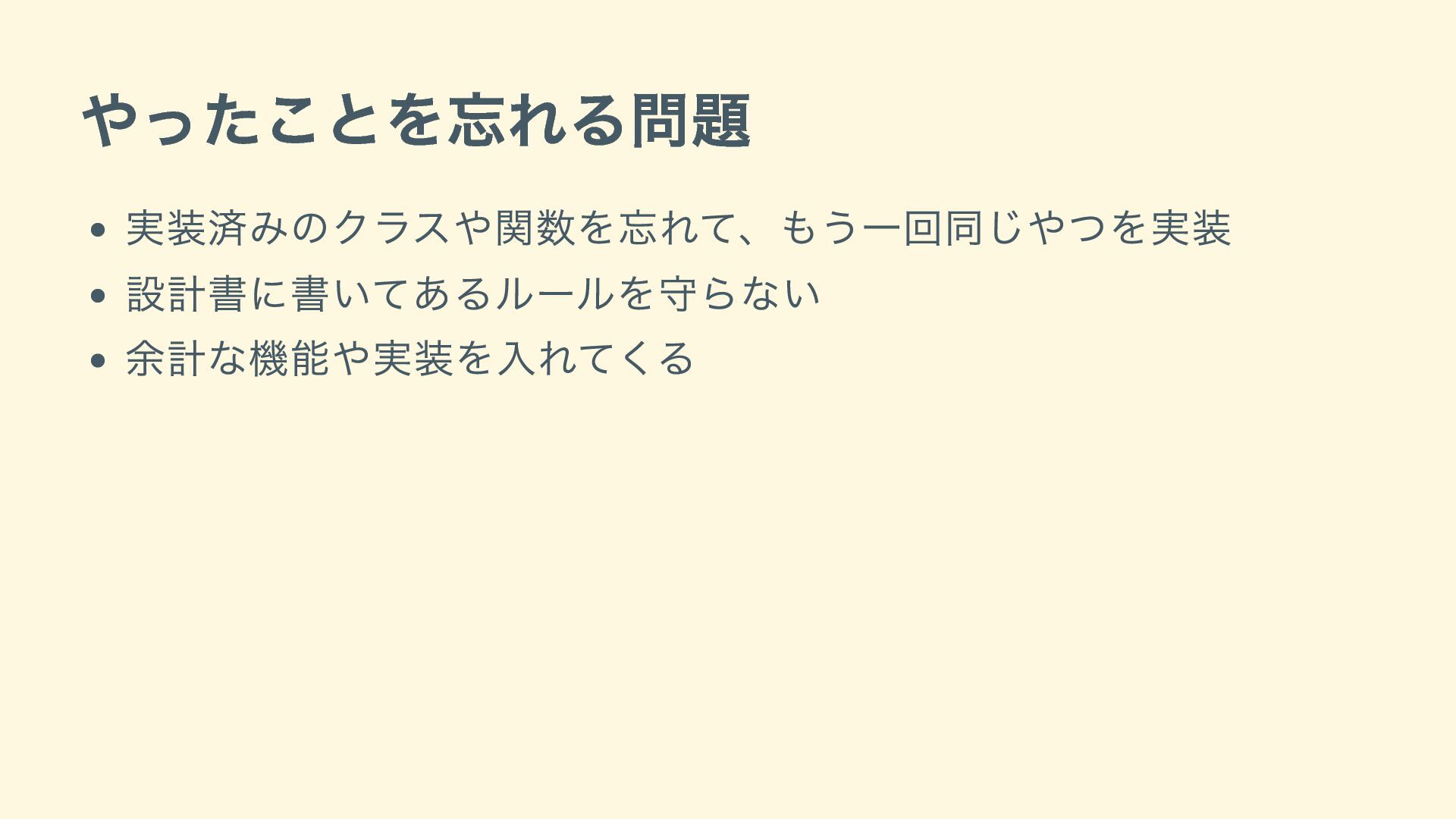 やったことを忘れる問題 実装済みのクラスや関数を忘れて、もう一回同じやつを実装 設計書に書いてあるルールを守らない 余計な機能や実装を入れてくる