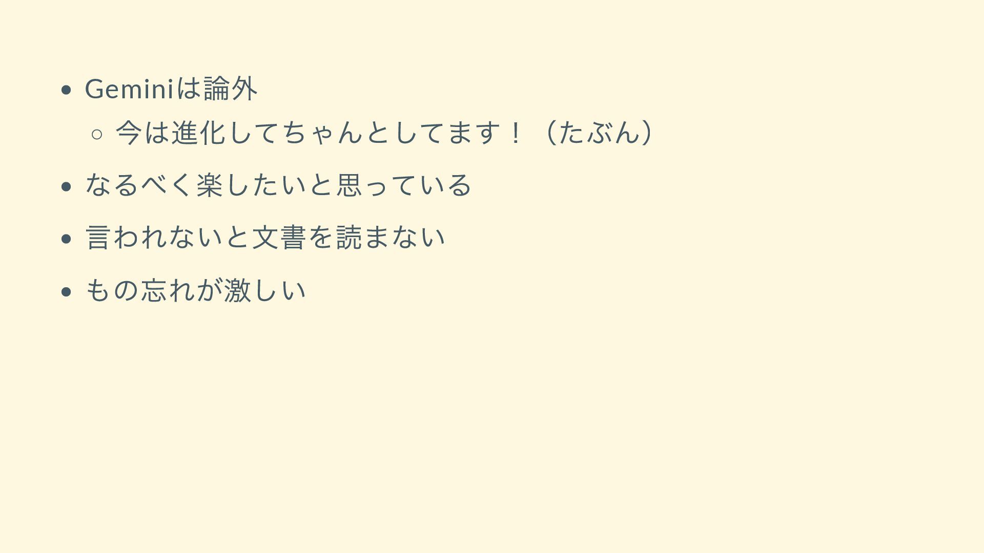 Gemini は論外 今は進化してちゃんとしてます!(たぶん) なるべく楽したいと思っている 言われないと文書を読まない もの忘れが激しい