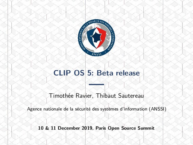 systèmes d’information ◮ French authority in the area of cyberdefence, network and information security ◮ Provides its expertise and technical assistance to government departments and businesses and plays an enhanced role in supporting operators of vital importance. ANSSI CLIP OS 5: Beta release 2/37