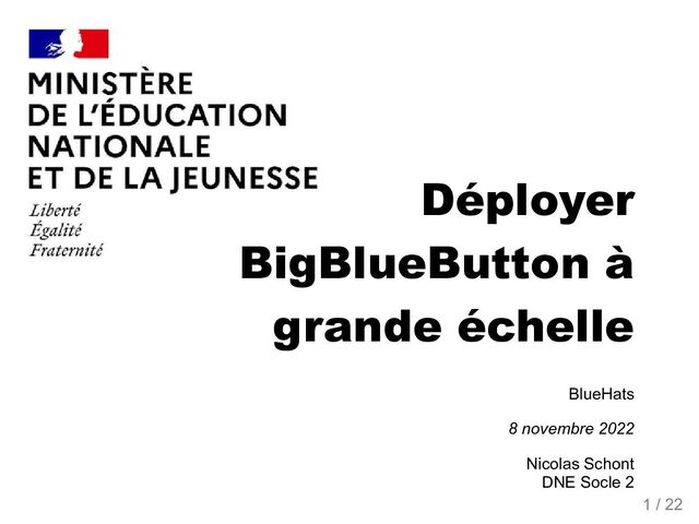l'éditeur de BigBlueButton afin d'échanger sur les besoins des enseignants et aussi d'inclure ces besoins dans la feuille de l'éditeur afin de ne pas forker le projet. Dépôt des documents en amont afin de préparer sa salle ; intégration de Peertube ; amélioration du répartiteur scalelite ; amélioration UX dans BBB ; amélioration de la gestion des ateliers ; intégration dans nextcloud (2.6) ; mise en place d'un tableau blanc interactif (tldraw en 2.6) ; 16 / 22