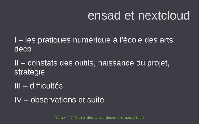 I – les pratiques numérique à l’école des arts déco II – constats des outils, naissance du projet, stratégie III – difficultés IV – observations et suite