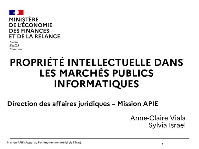 cadre du marché (Ex : développements informatiques spécifiques, paramétrages, conception de formation, étude spécifique, etc.) Connaissances antérieures standards Éléments soumis à une licence préexistante au marché (Ex : Logiciels standards, images de banques d’images, achat d’art, typographie, etc.) Connaissances antérieures Éléments créés par le titulaire, l’acheteur ou des tiers dans un cadre extérieur au marché (Ex : contenus préexistants ou créés indépendamment du marché, etc.) LIVRABLE DU MARCHE Droits de l’administration : - Utiliser les résultats, pendant toute la durée des droits d’auteur et le monde entier pour les besoins d’utilisation exprimés dans le marché ou découlant de l’objet des prestations - Cela comprend par défaut, le droit de : • publier et utiliser les résultats qui sont des documents préparatoires, études préalables ou spécifications • évaluer, assurer ou faire assurer par tout tiers l’évolution des résultats • procéder aux opérations d’archivage public • donner les mêmes droits à tout service au sein de la même personne morale • transférer les droits sur les résultats à tout tiers bénéficiaire d’un transfert de compétences de l’acheteur • pour les seuls logiciels, possibilité de rétrocéder tout droit à tout tiers ainsi que la possibilité de pouvoir les diffuser sous une licence libre / open source. - Pas de droit de commercialiser par défaut Droits du titulaire : - Réutiliser les résultats pour d’autres clients sauf si le résultat est « identitaire » pour l’acheteur (logo, marque, campagne de communication, etc.) ou confidentiel Dispositions spécifiques pour les résultats protégés par un droit de propriété industrielle relatif à des inventions et connaissances techniques : - Le titulaire a le droit de déposer des titres de propriété industrielle - Licence d’utilisation à l’acheteur, à défaut d’une autre répartition des droits RÉGIMES PRÉVUS PAR LE CCAG TIC