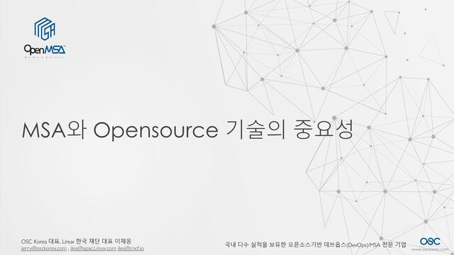 다릅니다. ▪ 어플리케이션은 특정 클라우드 제공자에 비 종속적인 “클라우드 네이티브”향으로 개발해야합니다. + + 서비스 중단없이 민첩한 시스템 변경 시스템의 이식성과 운영의 유연성 확보 신속한 애플리케이션 개발 & 배포 ► 전세계 개발자들의 집단 지식으로 급성장하고 있는 “오픈소스”를 활용해야만, 어플리케이션의 클라우드 호환성, 운용성, 이식성을 제공하는 진정한 클라우드 네이티브 환경을 만들 수 있습니다. MSA※ 전환 오픈소스기반 컨테이너 통합 관제 오픈소스기반 데브옵스 오픈소스기반 클라우드 ► 특정 클라우드 제공자들은 자체 개발한 기술 위주의 서비스(Lock-in)를 제공합니다. • • • 클라우드 네이티브 ≠