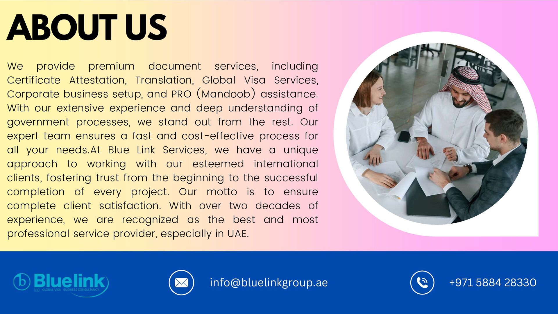 Certificate Attestation, Translation, Global Visa Services, Corporate business setup, and PRO (Mandoob) assistance. With our extensive experience and deep understanding of government processes, we stand out from the rest. Our expert team ensures a fast and cost-effective process for all your needs.At Blue Link Services, we have a unique approach to working with our esteemed international clients, fostering trust from the beginning to the successful completion of every project. Our motto is to ensure complete client satisfaction. With over two decades of experience, we are recognized as the best and most professional service provider, especially in UAE. ABOUT US