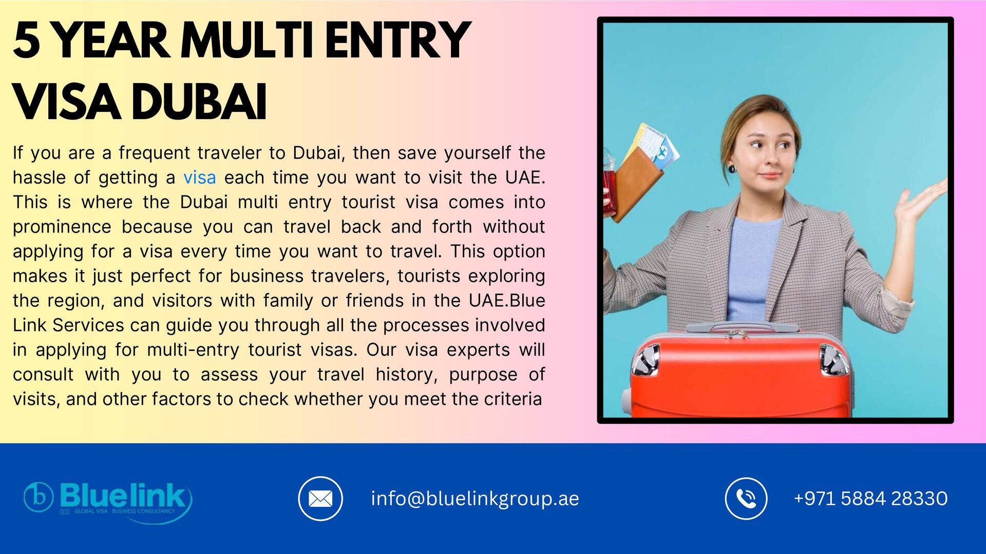 to Dubai, then save yourself the hassle of getting a visa each time you want to visit the UAE. This is where the Dubai multi entry tourist visa comes into prominence because you can travel back and forth without applying for a visa every time you want to travel. This option makes it just perfect for business travelers, tourists exploring the region, and visitors with family or friends in the UAE.Blue Link Services can guide you through all the processes involved in applying for multi-entry tourist visas. Our visa experts will consult with you to assess your travel history, purpose of visits, and other factors to check whether you meet the criteria 5 YEAR MULTI ENTRY VISA DUBAI