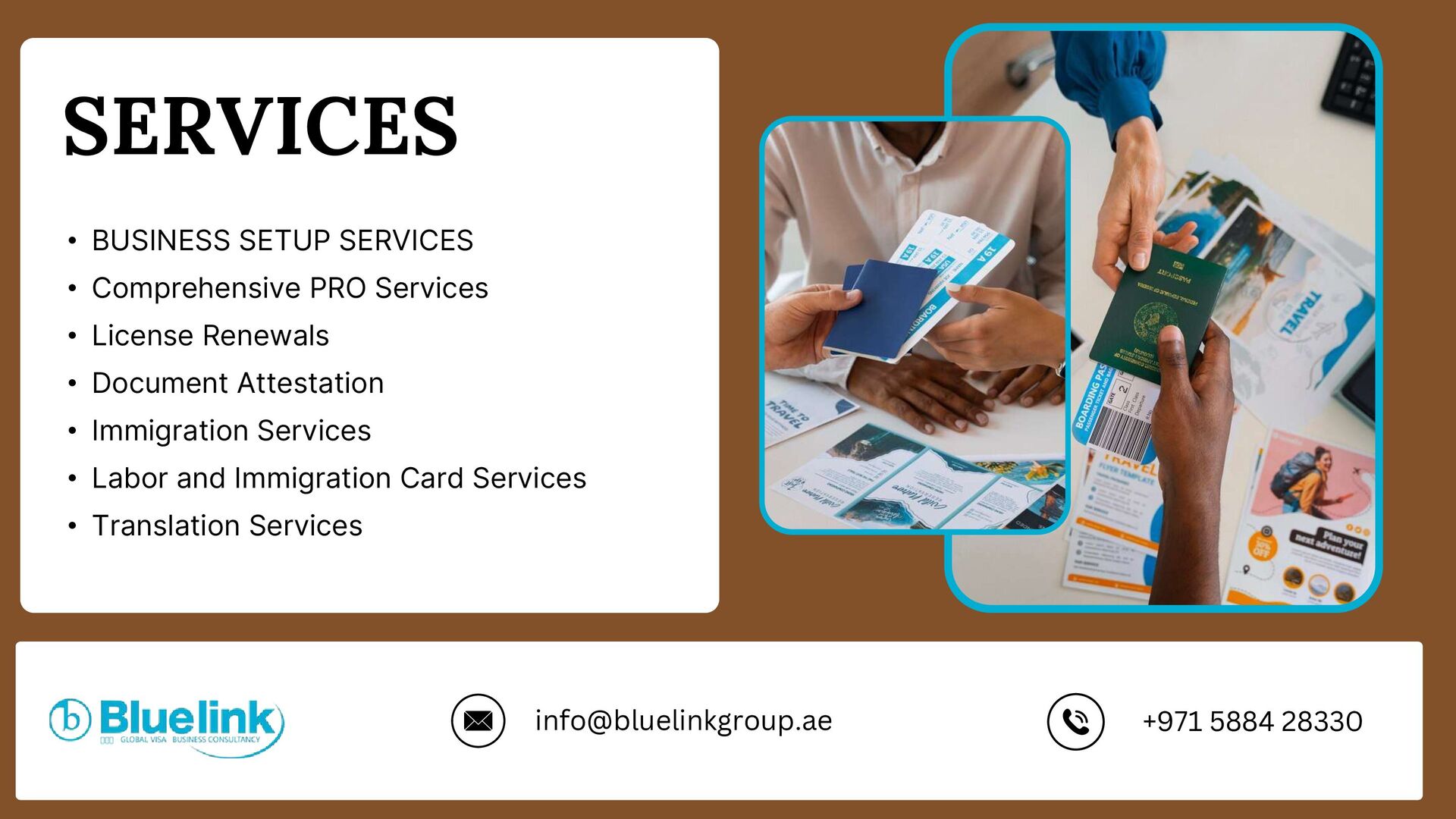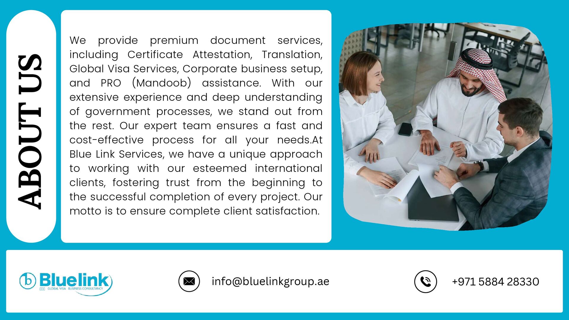 Certificate Attestation, Translation, Global Visa Services, Corporate business setup, and PRO (Mandoob) assistance. With our extensive experience and deep understanding of government processes, we stand out from the rest. Our expert team ensures a fast and cost-effective process for all your needs.At Blue Link Services, we have a unique approach to working with our esteemed international clients, fostering trust from the beginning to the successful completion of every project. Our motto is to ensure complete client satisfaction. ABOUT US
