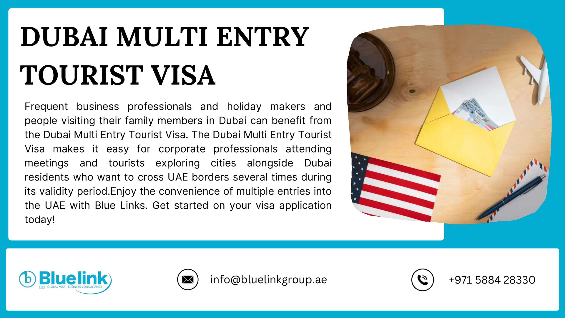 and people visiting their family members in Dubai can benefit from the Dubai Multi Entry Tourist Visa. The Dubai Multi Entry Tourist Visa makes it easy for corporate professionals attending meetings and tourists exploring cities alongside Dubai residents who want to cross UAE borders several times during its validity period.Enjoy the convenience of multiple entries into the UAE with Blue Links. Get started on your visa application today! DUBAI MULTI ENTRY TOURIST VISA