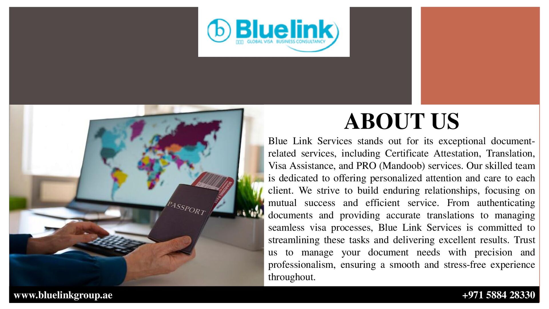 out for its exceptional document- related services, including Certificate Attestation, Translation, Visa Assistance, and PRO (Mandoob) services. Our skilled team is dedicated to offering personalized attention and care to each client. We strive to build enduring relationships, focusing on mutual success and efficient service. From authenticating documents and providing accurate translations to managing seamless visa processes, Blue Link Services is committed to streamlining these tasks and delivering excellent results. Trust us to manage your document needs with precision and professionalism, ensuring a smooth and stress-free experience throughout.