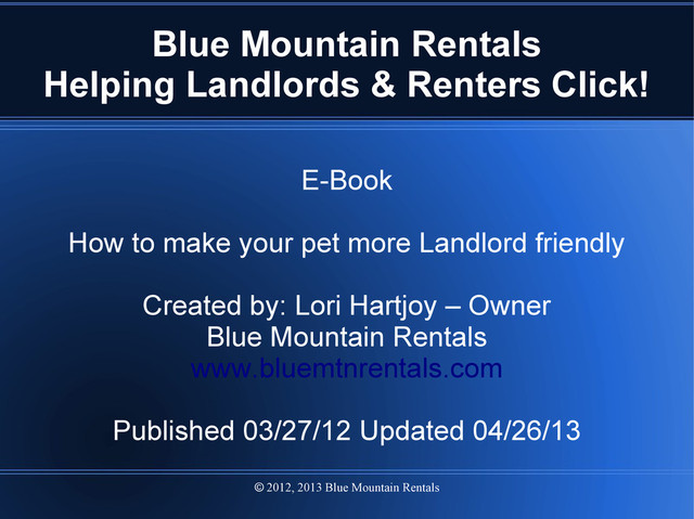 Landlords & Renters Click! E-Book How to make your pet more Landlord friendly Created by: Lori Hartjoy – Owner Blue Mountain Rentals www.bluemtnrentals.com Published 03/27/12 Updated 04/26/13