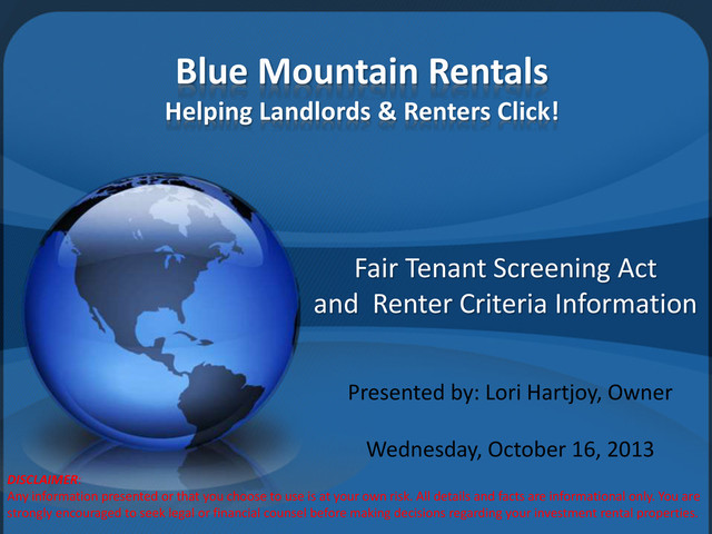 Presented on October 16, 2013 - This workshop covers the Fair Tenant Screening Act established in June 2012 for WA State, Renter Criteria and how to set it up, Current legislation for continued changes and information on Adverse Action notice & screening your next tenant. Great information for Renters & Landlords alike.