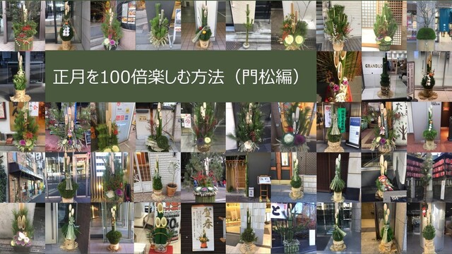 が二本だったりするが、門松での登場頻度は稀) • 門松界隈では少数派 • モウソウチクは“どちらかというと”色味が淡い • 竹の節が一本なのがモウソウチク • 更に、節の周りに蝋のような白いモノが残っていれ ばそれは若いモウソウチク(一年生や二年生) • 日本の竹林面積の大半を占め、門松界隈でも 多数派(特に、大型の門松はたいていこちら) 節が二本 節が二本 節が二本 節が一本 かつ白蝋アリ ま、それほど気にしなくてもいいんじゃないでしょうか。 • マダケとモウソウチクどちらにせよ、意義は変わらない (繁栄や生命力の強さの象徴) • そもそも、見た目が似すぎているので判別が困難 • 人に説明するときに、その差を分かってもらいづらい……などなど (話のタネになりづらい) ちなみに、ときどきマダケやモウソウチク以外も使われています。 結構レアリティが高いので探してみてもよいかもしれない。