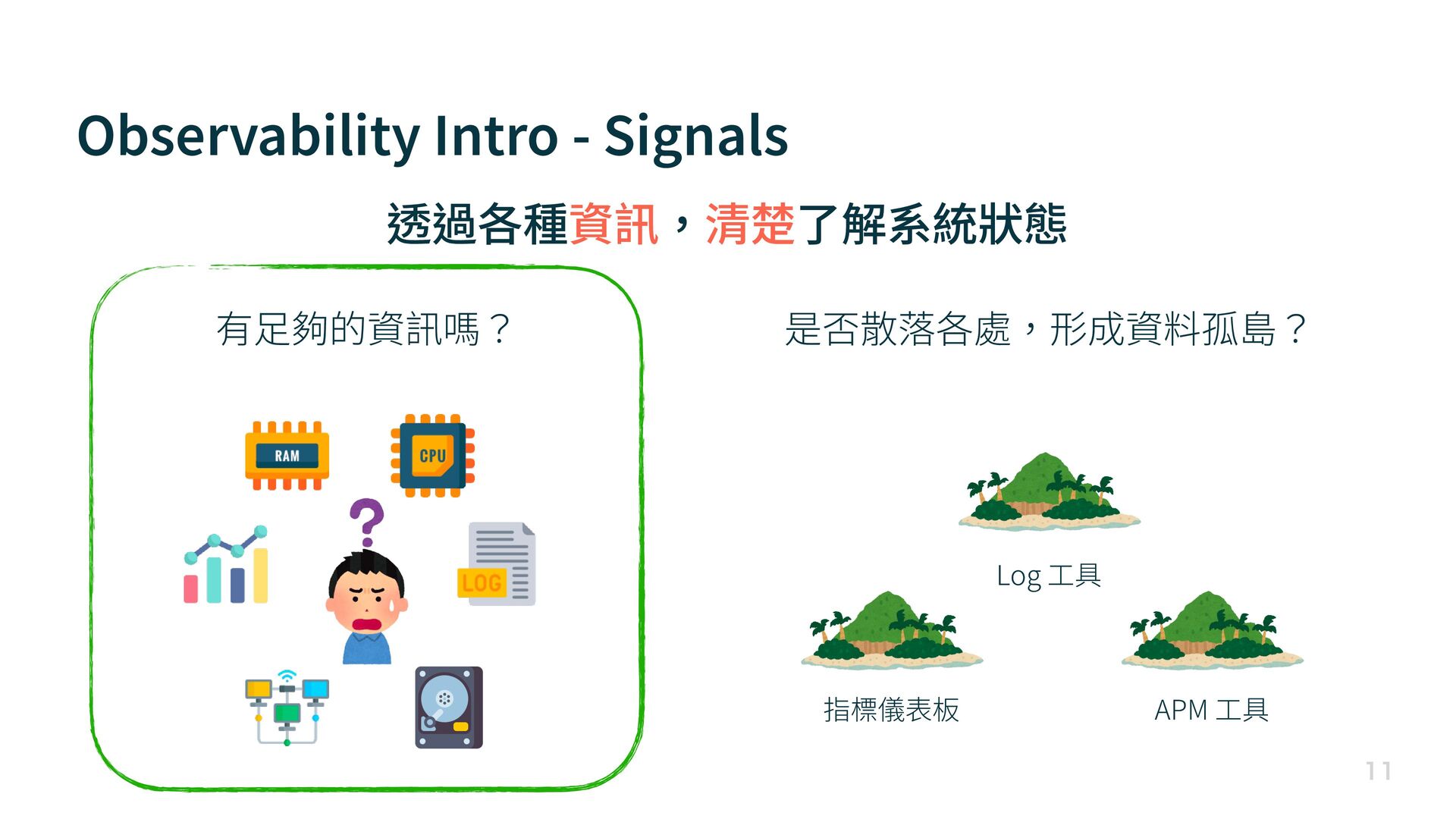 Observability Intro - Signals 有 足 夠的資訊嗎? 透過各種資訊,清楚了解系統狀態 Log