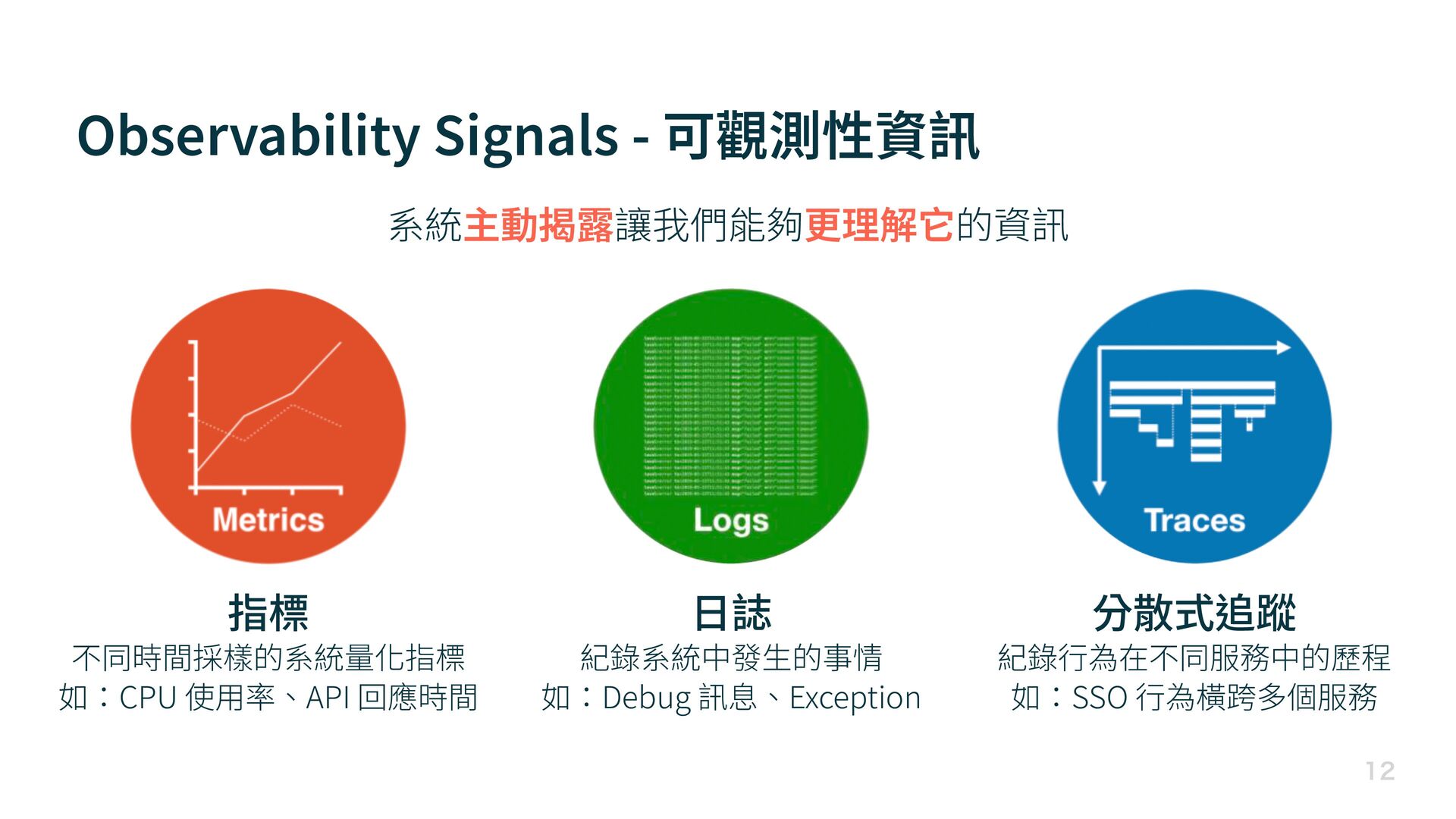率、API 回應時間 日 誌 紀錄系統中發 生 的事情 如:Debug 訊息、Exception 分散式追蹤 紀錄 行 為在不同服務中的歷程 如:SSO 行 為橫跨多個服務 系統主動揭露讓我們能夠更理解它的資訊