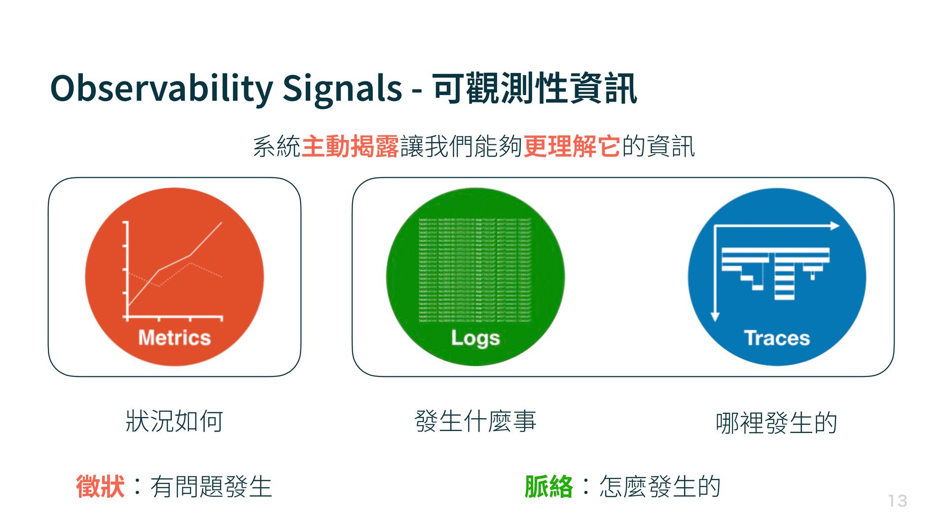 Observability Signals - 可觀測性資訊 徵狀:有問題發 生 脈絡:怎麼發 生 的