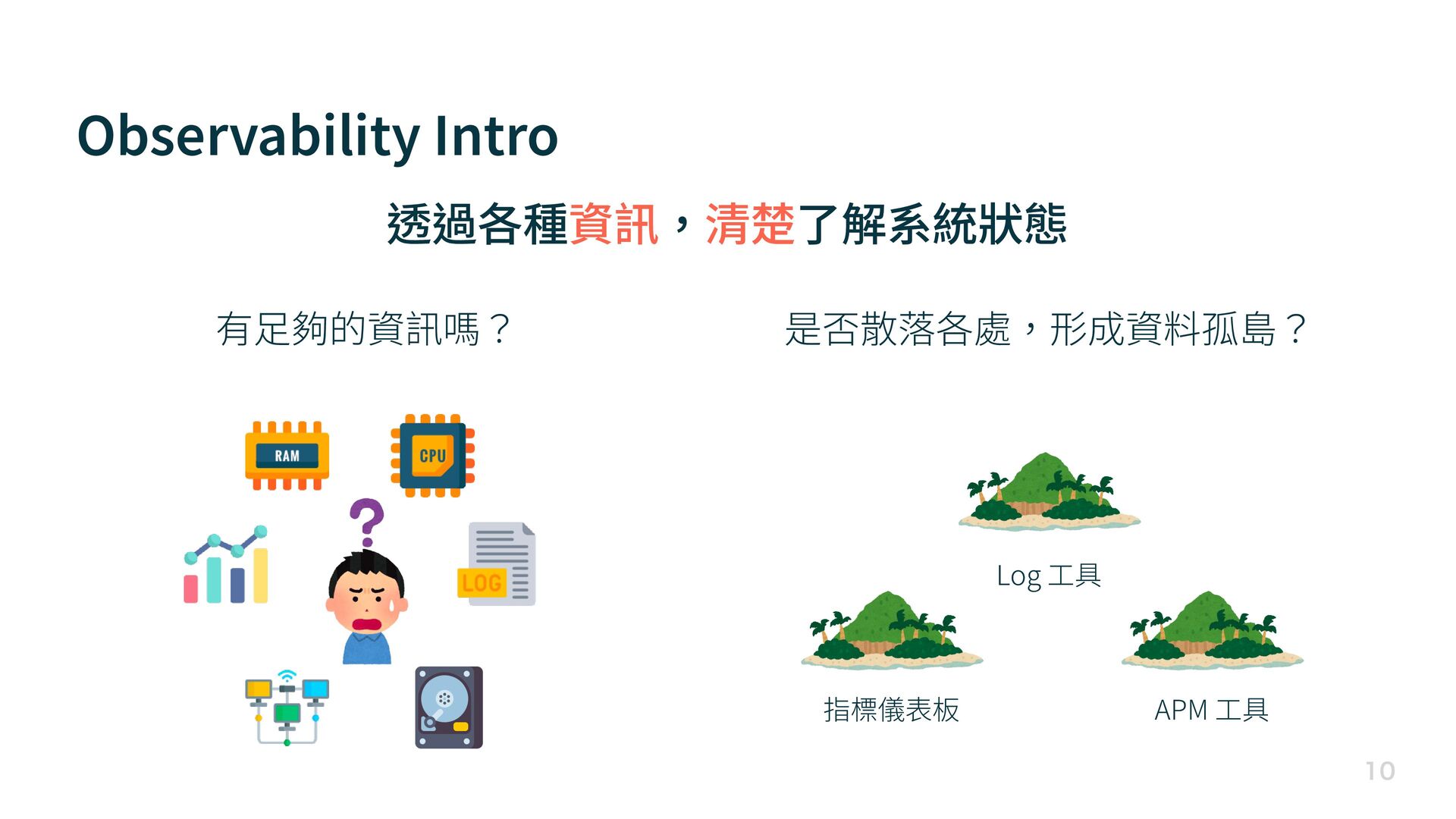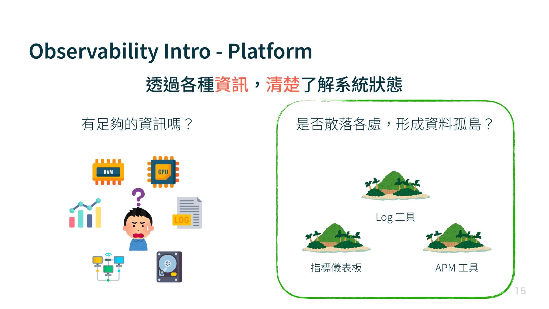 Observability Intro - Platform 有 足 夠的資訊嗎? 是否散落各處,形成資料孤島? 透過各種資訊,清楚了解系統狀態