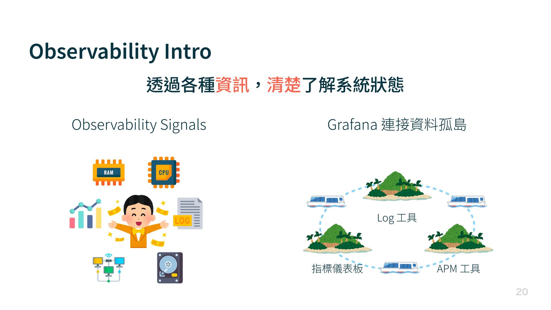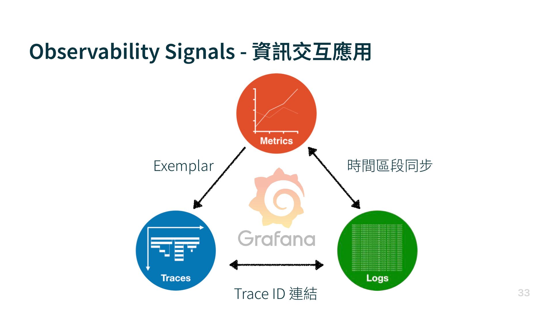 Observability Intro Observability Signals Grafana 連接資料孤島 透過各種資訊,清楚了解系統狀態 Log