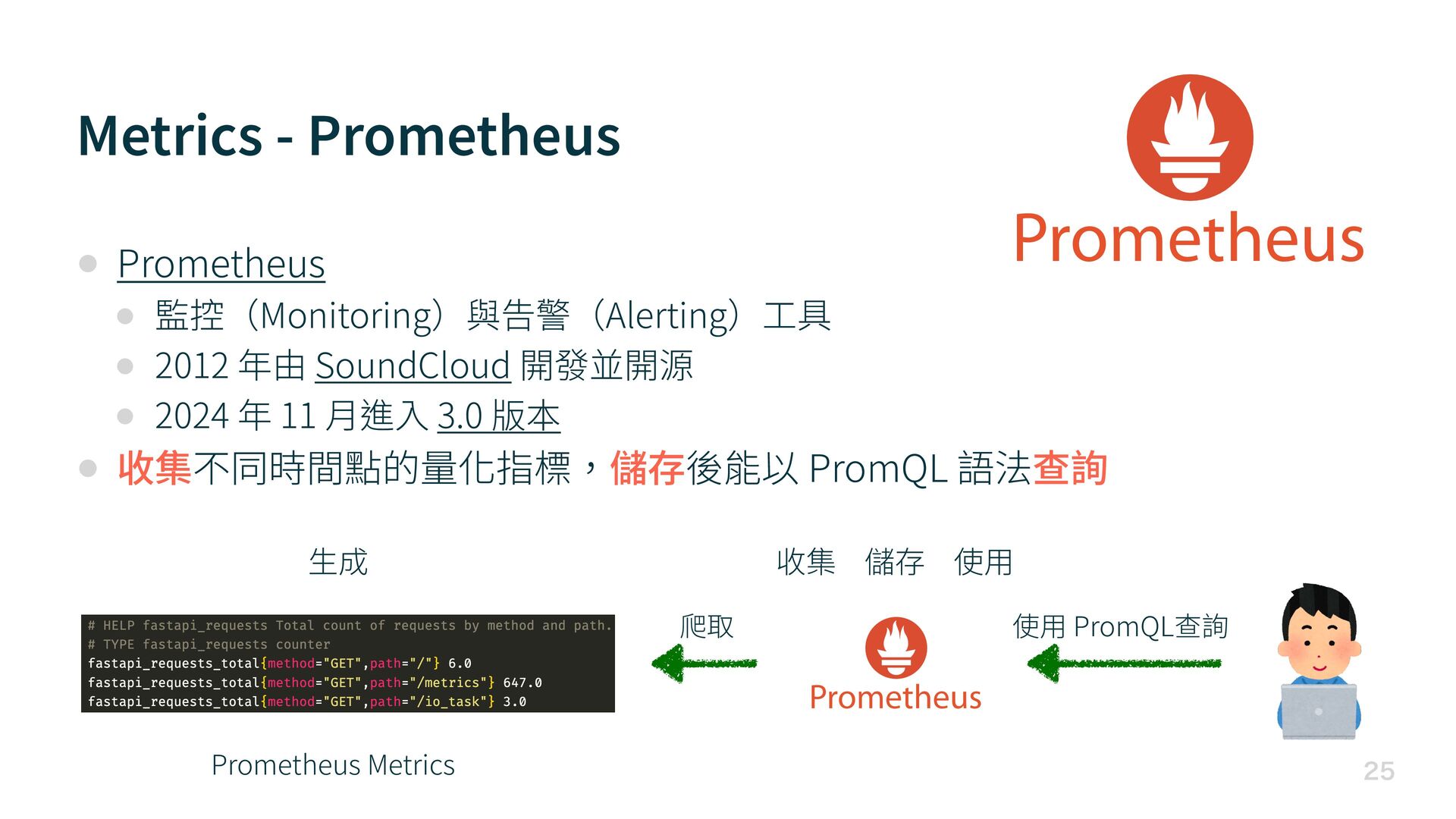 • 2012 年由 SoundCloud 開發並開源 • 2024 年 11 月 進 入 3.0 版本 • 收集不同時間點的量化指標,儲存後能以 PromQL 語法查詢 Prometheus Metrics 爬取 使 用 PromQL查詢 生 成 收集 儲存 使 用