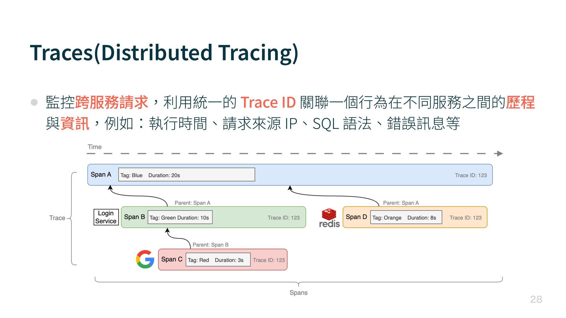 Traces(Distributed Tracing) • 監控跨服務請求,利 用 統 一 的 Trace