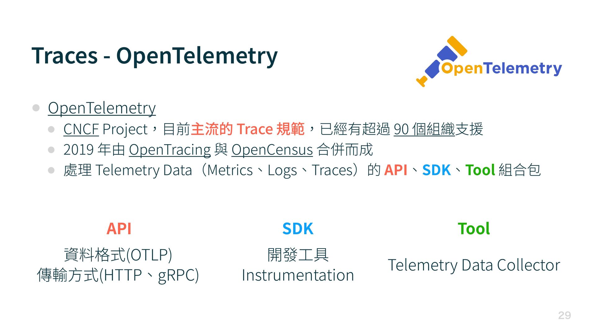 前主流的 Trace 規範,已經有超過 90 個組織 支 援 • 2019 年由 OpenTracing 與 OpenCensus 合併 而 成 • 處理 Telemetry Data(Metrics、Logs、Traces)的 API、SDK、Tool 組合包 API SDK Tool 資料格式(OTLP) 傳輸 方 式(HTTP、gRPC) 開發 工 具 Instrumentation Telemetry Data Collector