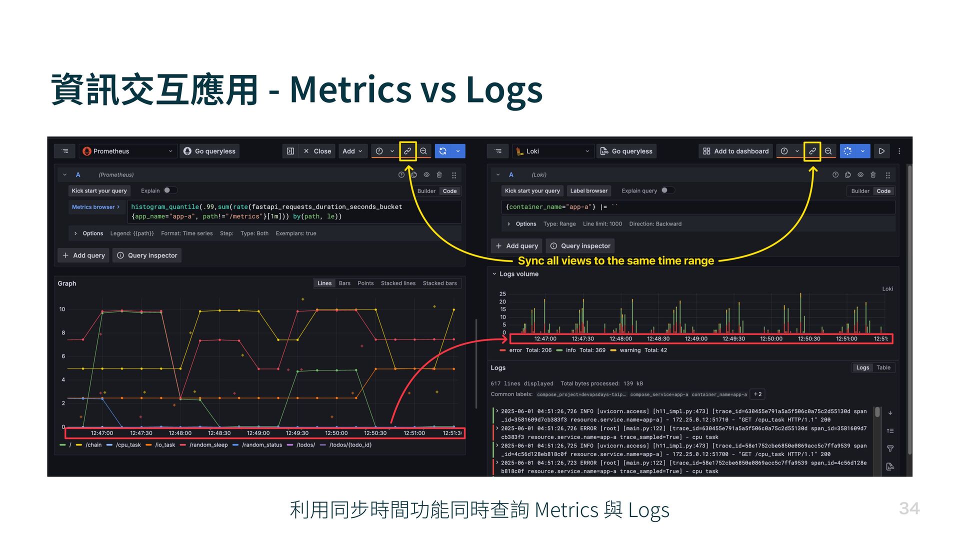 資訊交互應 用 - Metrics vs Logs 利 用 同步時間功能同時查詢