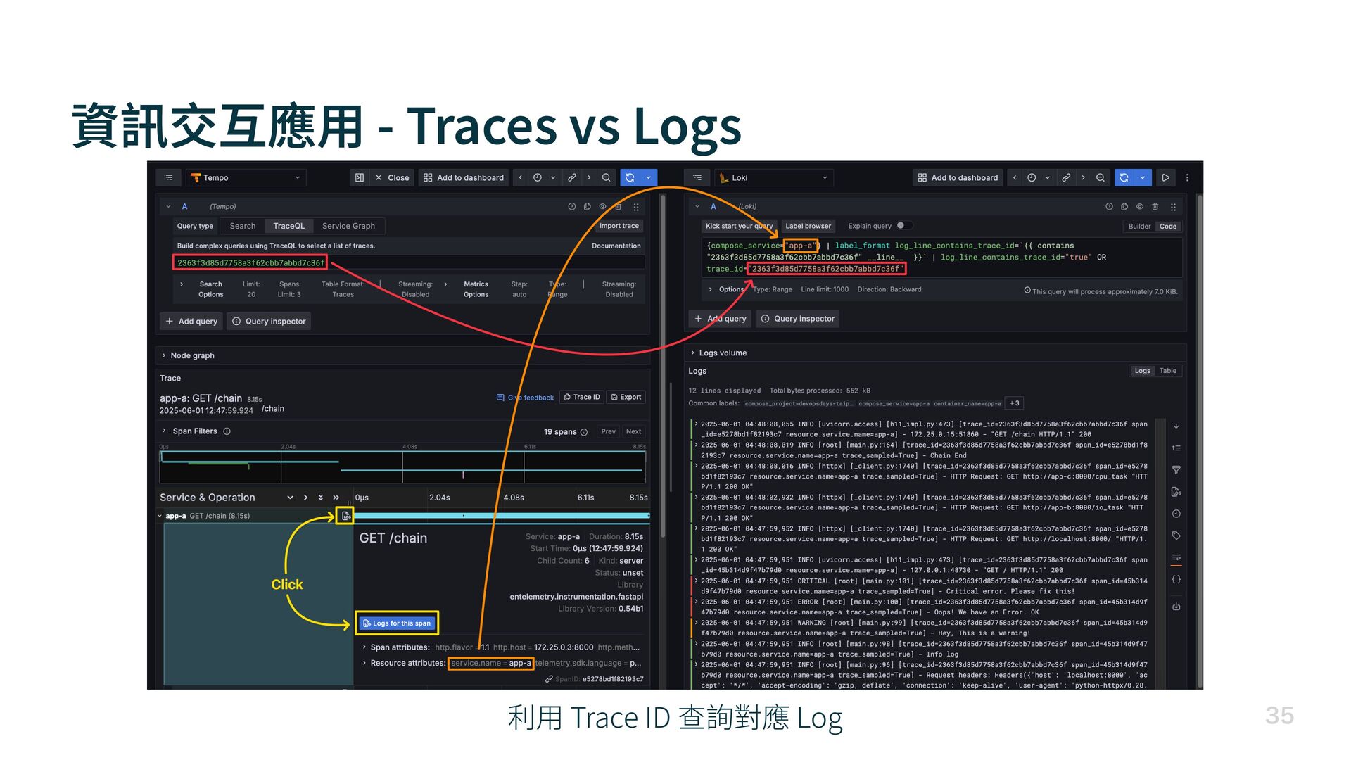 資訊交互應 用 - Traces vs Logs 利 用 Trace