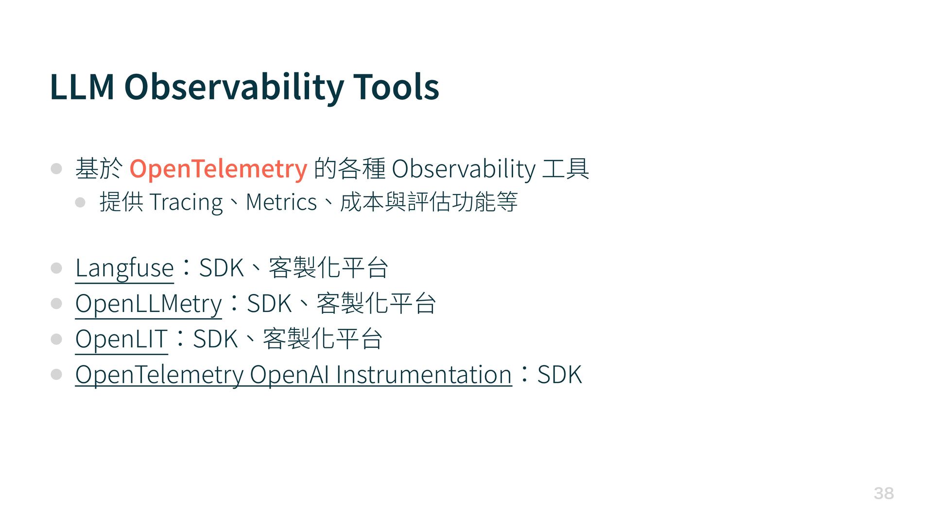 具 • 提供 Tracing、Metrics、成本與評估功能等 • Langfuse:SDK、客製化平台 • OpenLLMetry:SDK、客製化平台 • OpenLIT:SDK、客製化平台 • OpenTelemetry OpenAI Instrumentation:SDK