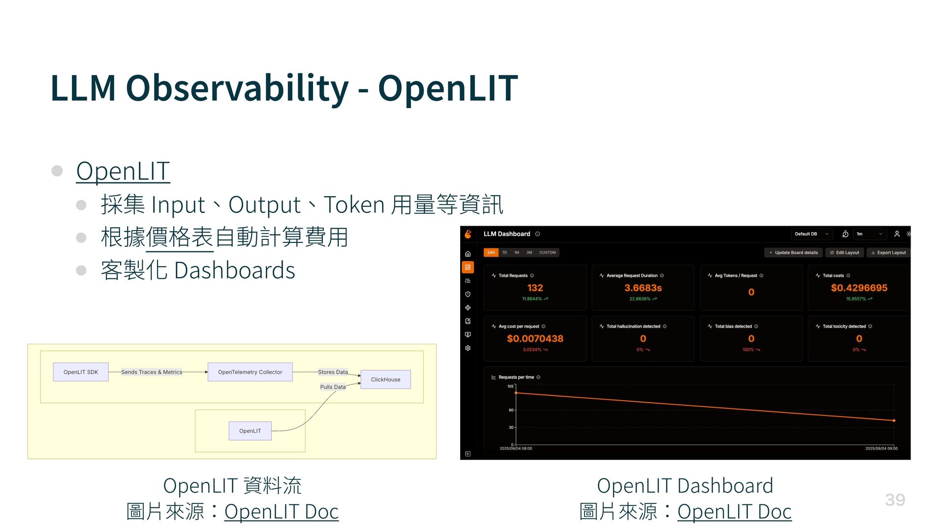 動計算費 用 • 客製化 Dashboards LLM Observability - OpenLIT OpenLIT 資料流 圖 片 來源:OpenLIT Doc OpenLIT Dashboard 圖 片 來源:OpenLIT Doc