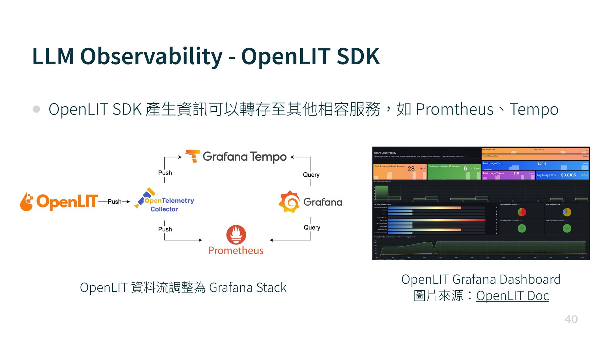 生 資訊可以轉存 至 其他相容服務,如 Promtheus、Tempo OpenLIT Grafana Dashboard 圖 片 來源:OpenLIT Doc OpenLIT 資料流調整為 Grafana Stack