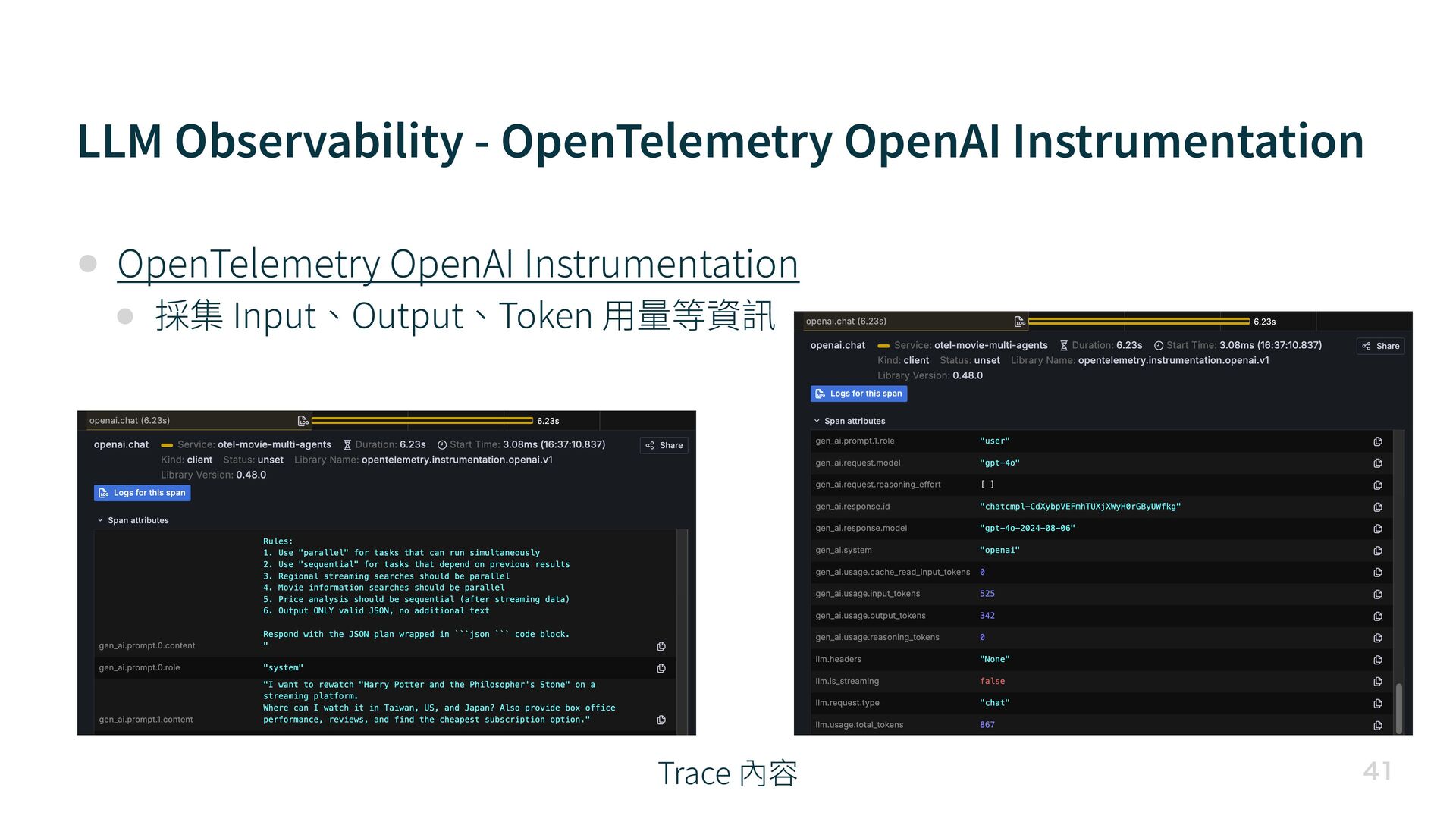 Instrumentation • 採集 Input、Output、Token 用 量等資訊 Trace 內容