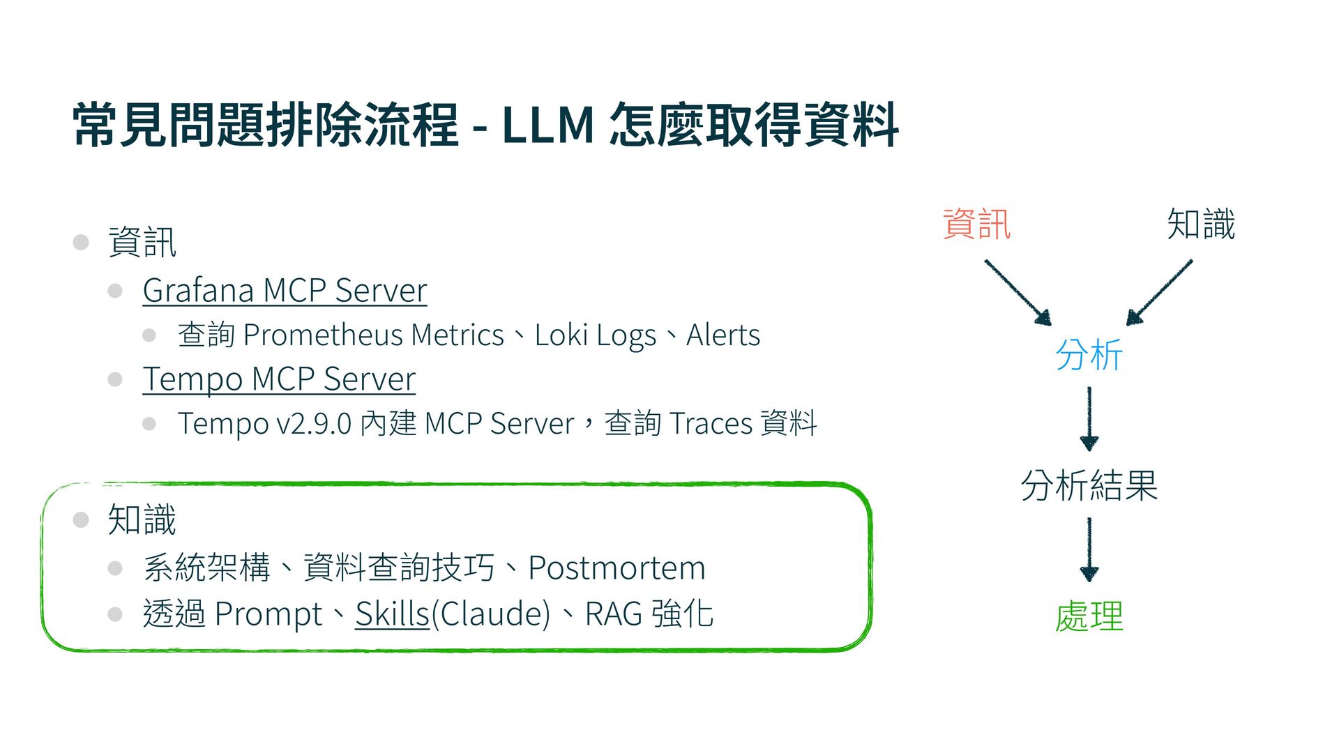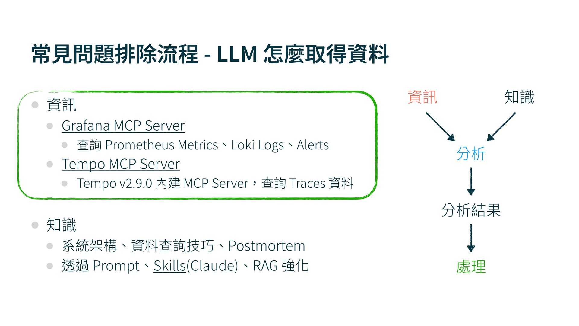 MCP Server • 查詢 Prometheus Metrics、Loki Logs、Alerts • Tempo MCP Server • Tempo v 2 . 9 . 0 內建 MCP Server,查詢 Traces 資料 • 知識 • 系統架構、資料查詢技巧、Postmortem • 透過 Prompt、Skills(Claude)、RAG 強化 分析 處理 分析結果 資訊 知識