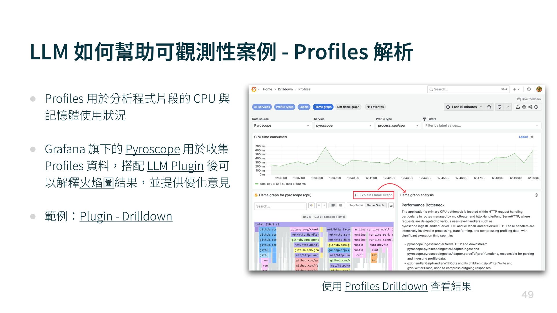 fi les 用 於分析程式 片 段的 CPU 與 記憶體使 用 狀況 • Grafana 旗下的 Pyroscope 用 於收集 Pro fi les 資料,搭配 LLM Plugin 後可 以解釋 火 焰圖結果,並提供優化意 見 • 範例:Plugin - Drilldown 使 用 Pro fi les Drilldown 查看結果
