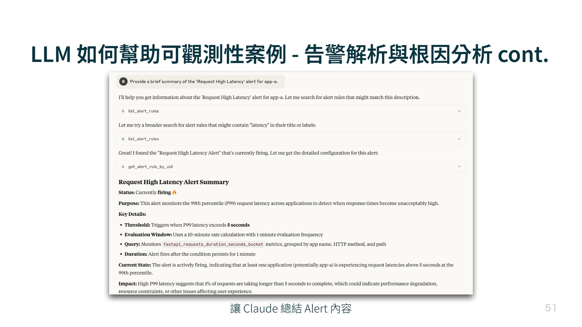 LLM 如何幫助可觀測性案例 - 告警解析與根因分析 cont. 讓 Claude 總結 Alert