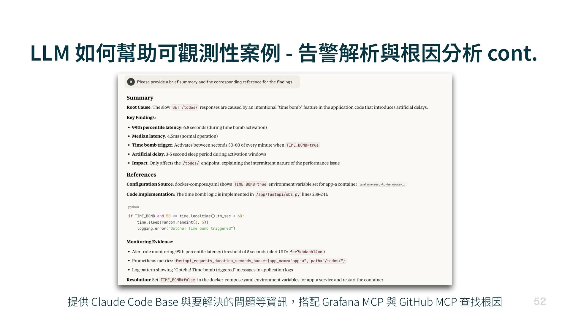 跟 GitHub MCP 排查問題 • 範例:Grafana Zero to Hero Use Case: Grafana with LLM 從 Alerting 發現有 Request High Latency 的問題