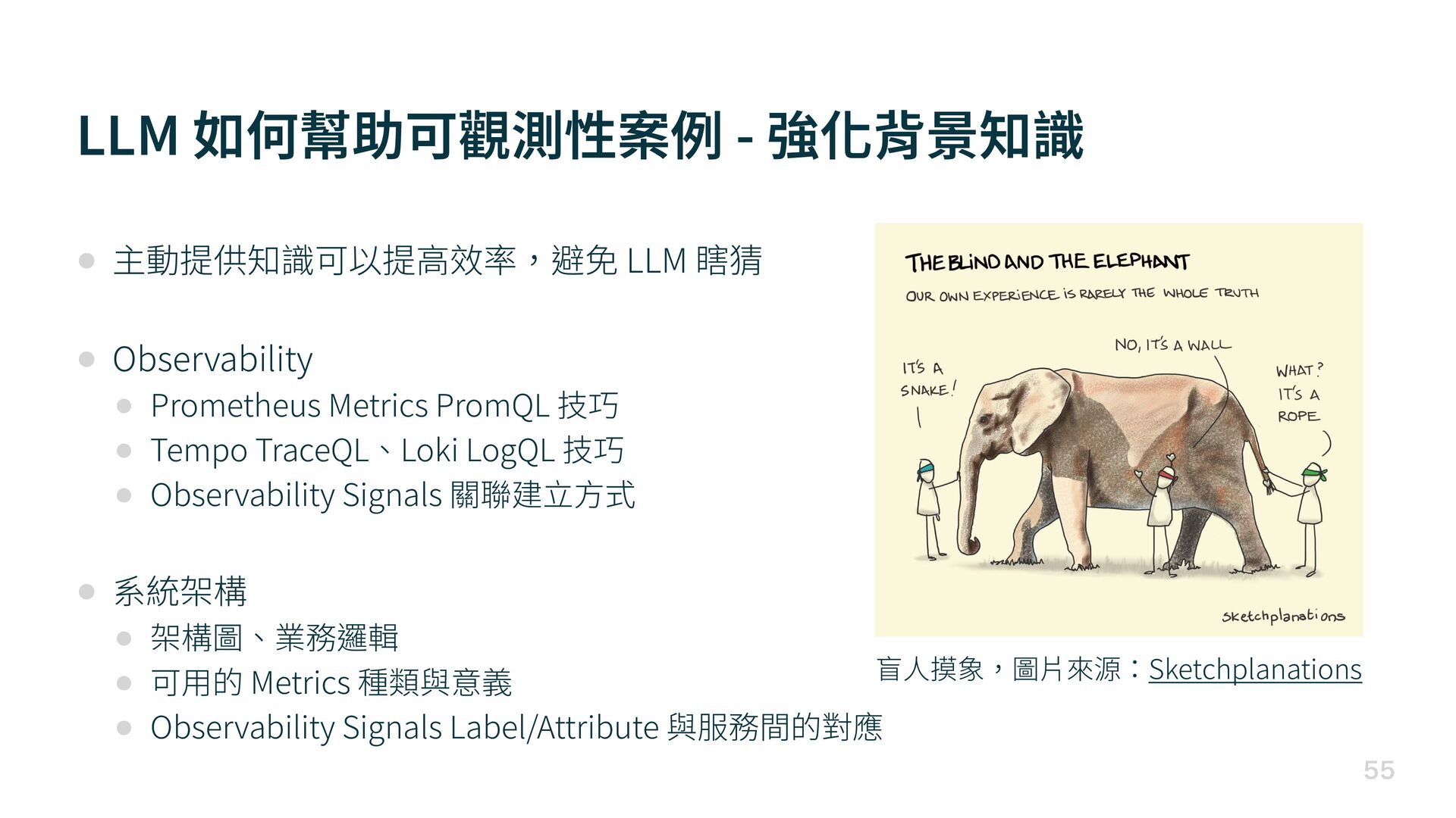 瞎猜 • Observability • Prometheus Metrics PromQL 技巧 • Tempo TraceQL、Loki LogQL 技巧 • Observability Signals 關聯建 立方 式 • 系統架構 • 架構圖、業務邏輯 • 可 用 的 Metrics 種類與意義 • Observability Signals Label/Attribute 與服務間的對應 盲 人 摸象,圖 片 來源:Sketchplanations