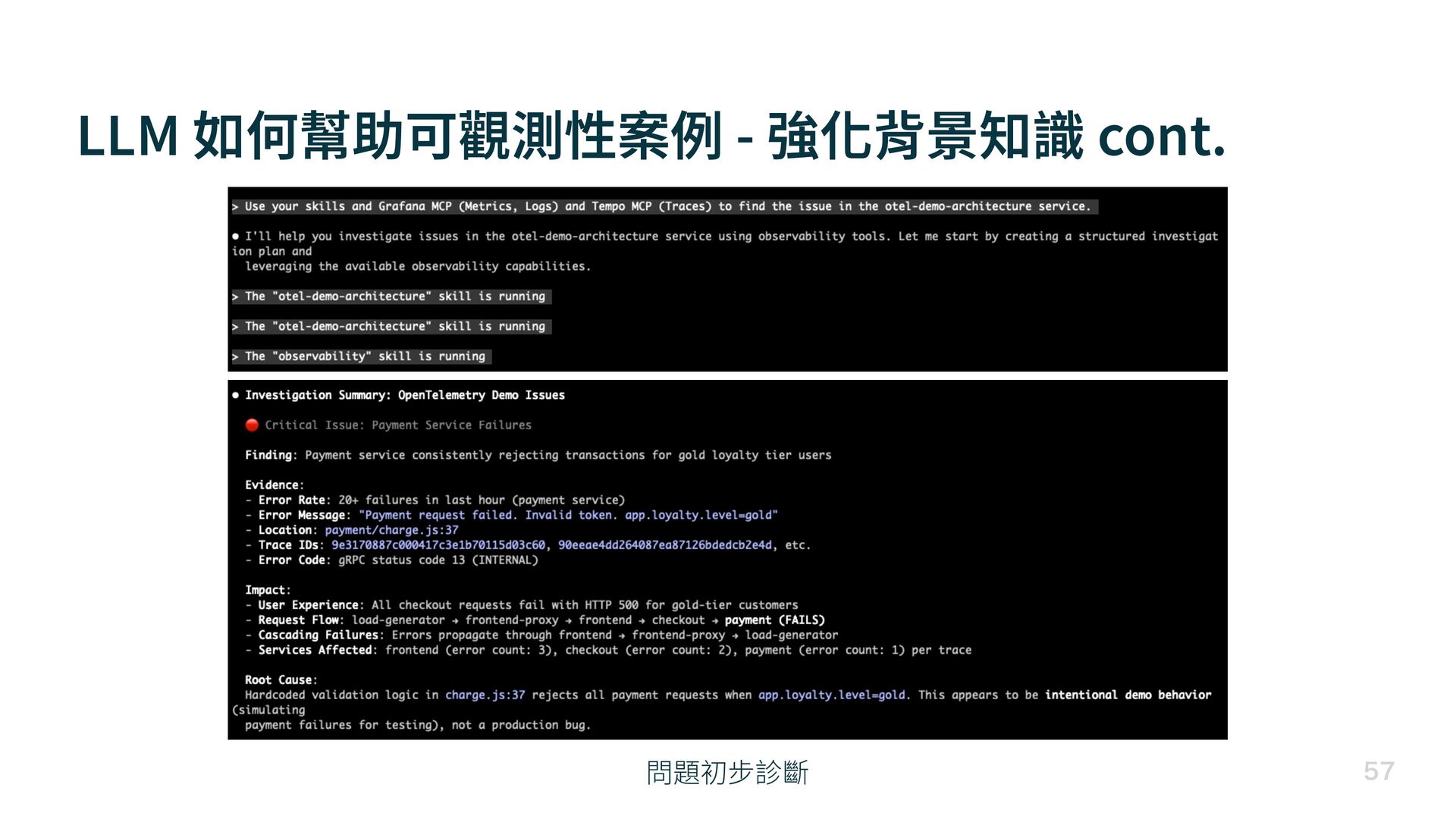 LLM 如何幫助可觀測性案例 - 強化背景知識 cont. 問題初步診斷
