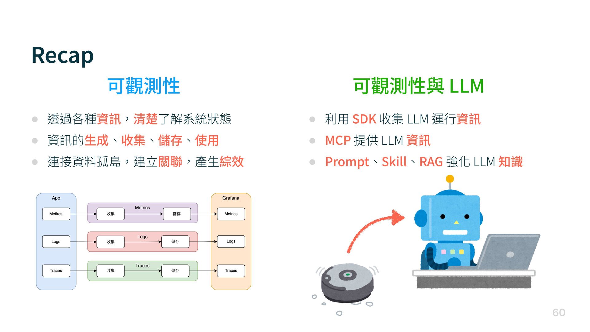 連接資料孤島,建 立 關聯,產 生 綜效 • 利 用 SDK 收集 LLM 運 行 資訊 • MCP 提供 LLM 資訊 • Prompt、Skill、RAG 強化 LLM 知識 可觀測性 可觀測性與 LLM
