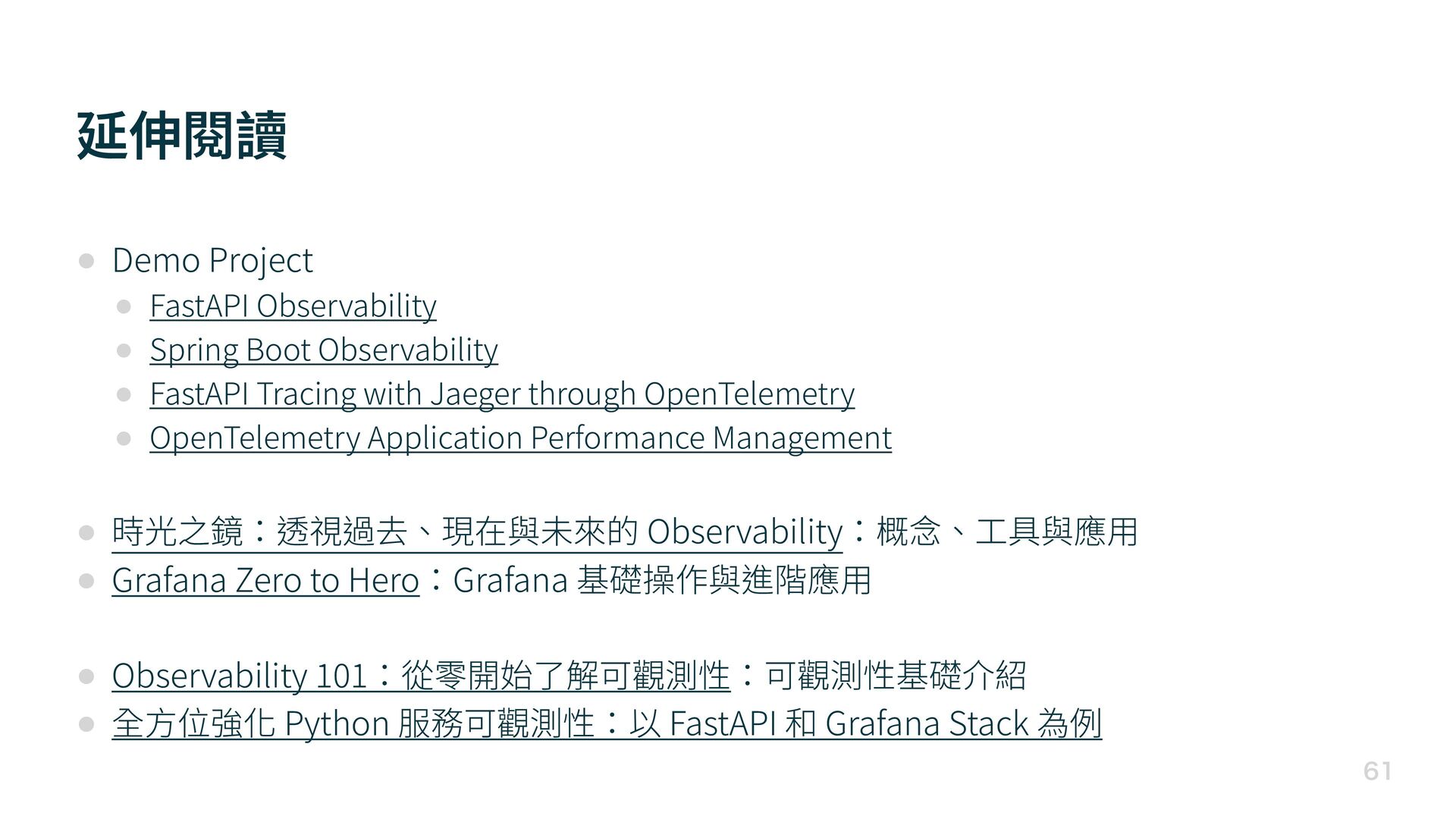 Boot Observability • FastAPI Tracing with Jaeger through OpenTelemetry • OpenTelemetry Application Performance Management • 時光之鏡:透視過去、現在與未來的 Observability:概念、 工 具與應 用 • Grafana Zero to Hero:Grafana 基礎操作與進階應 用 • Observability 1 0 1 :從零開始了解可觀測性:可觀測性基礎介紹 • 全 方 位強化 Python 服務可觀測性:以 FastAPI 和 Grafana Stack 為例
