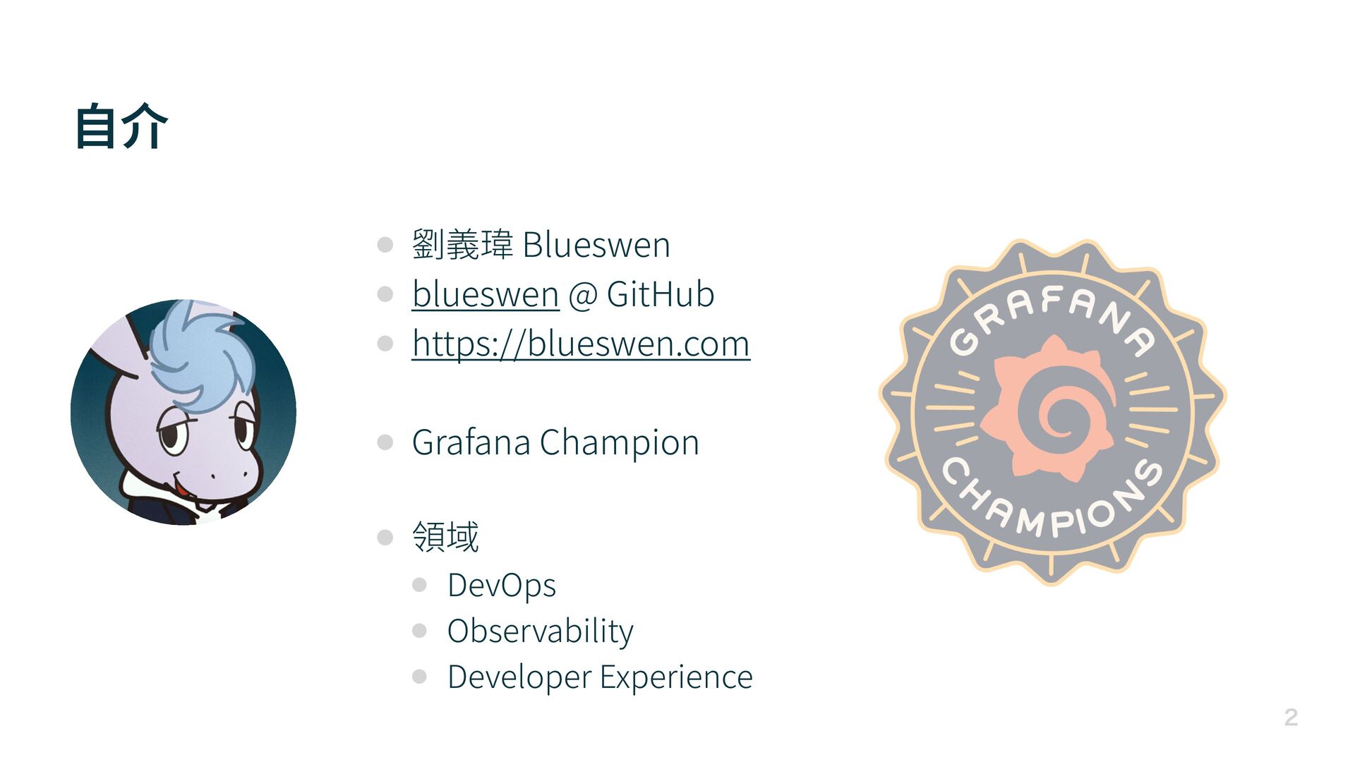 • https://blueswen.com • Grafana Champion • 領域 • DevOps • Observability • Developer Experience