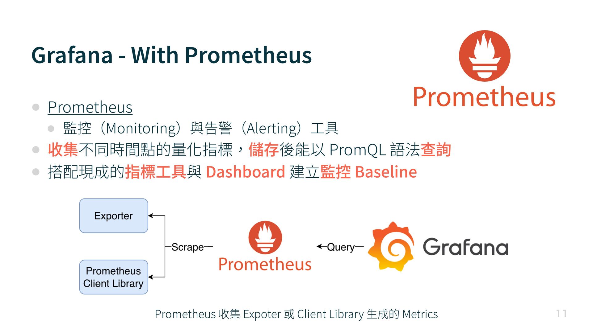 具 • 收集不同時間點的量化指標,儲存後能以 PromQL 語法查詢 • 搭配現成的指標 工 具與 Dashboard 建 立 監控 Baseline Prometheus 收集 Expoter 或 Client Library 生 成的 Metrics