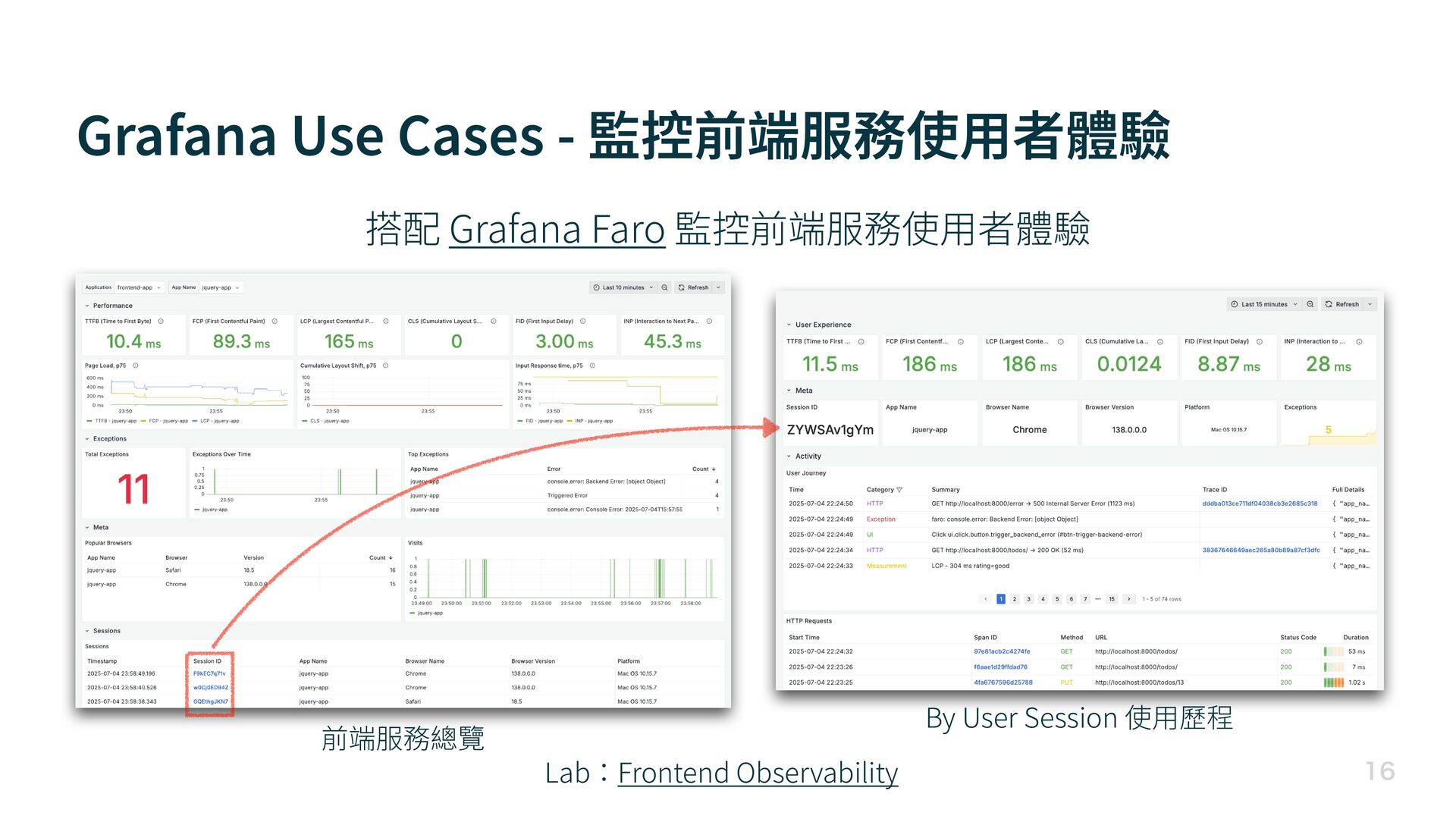 Faro 監控前端服務使 用 者體驗 Lab:Frontend Observability By User Session 使 用 歷程 前端服務總覽