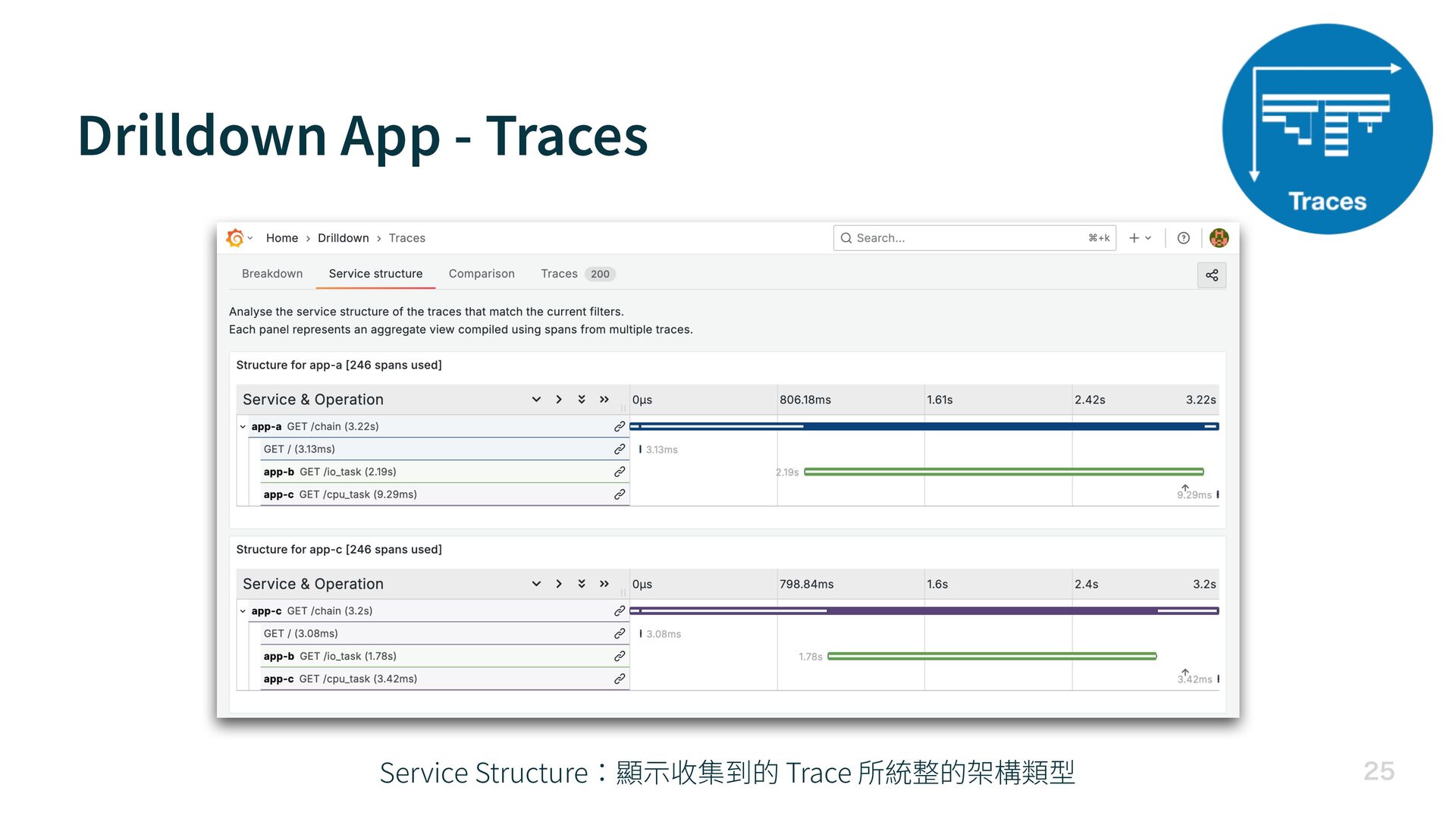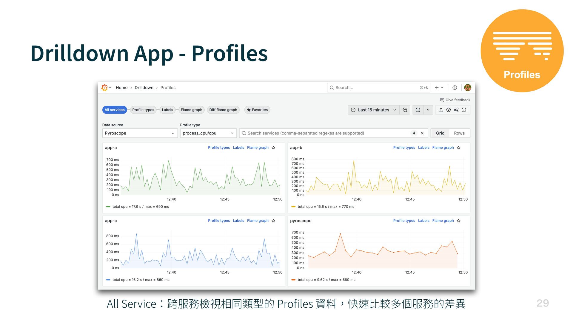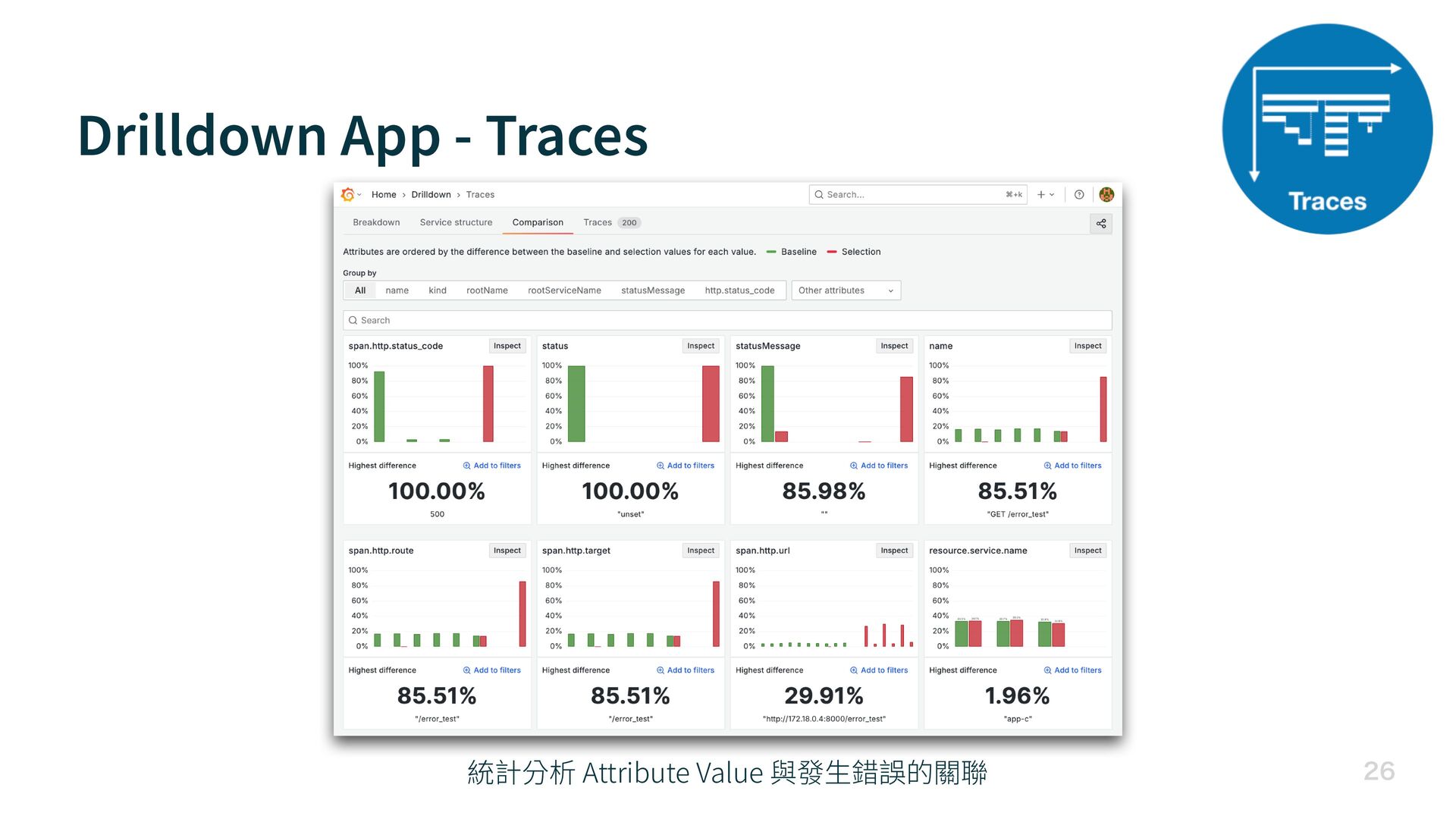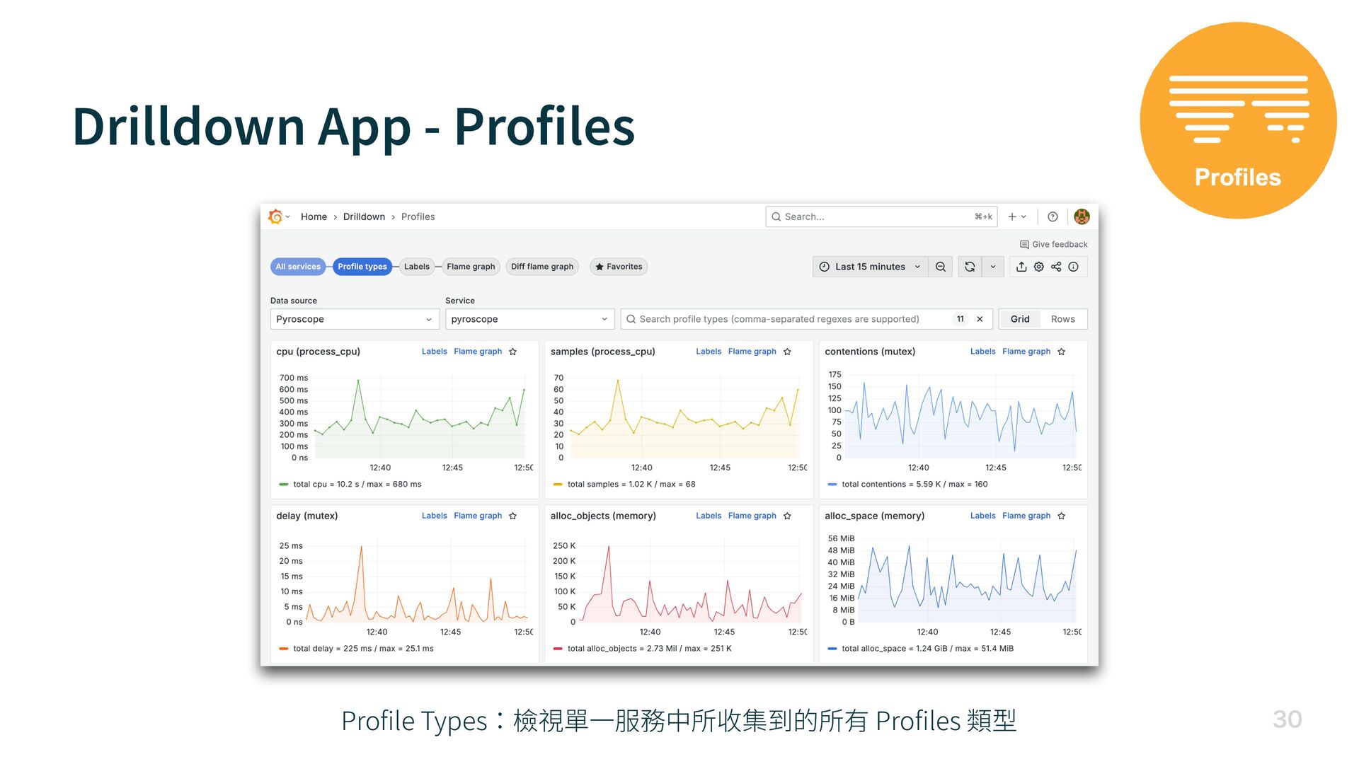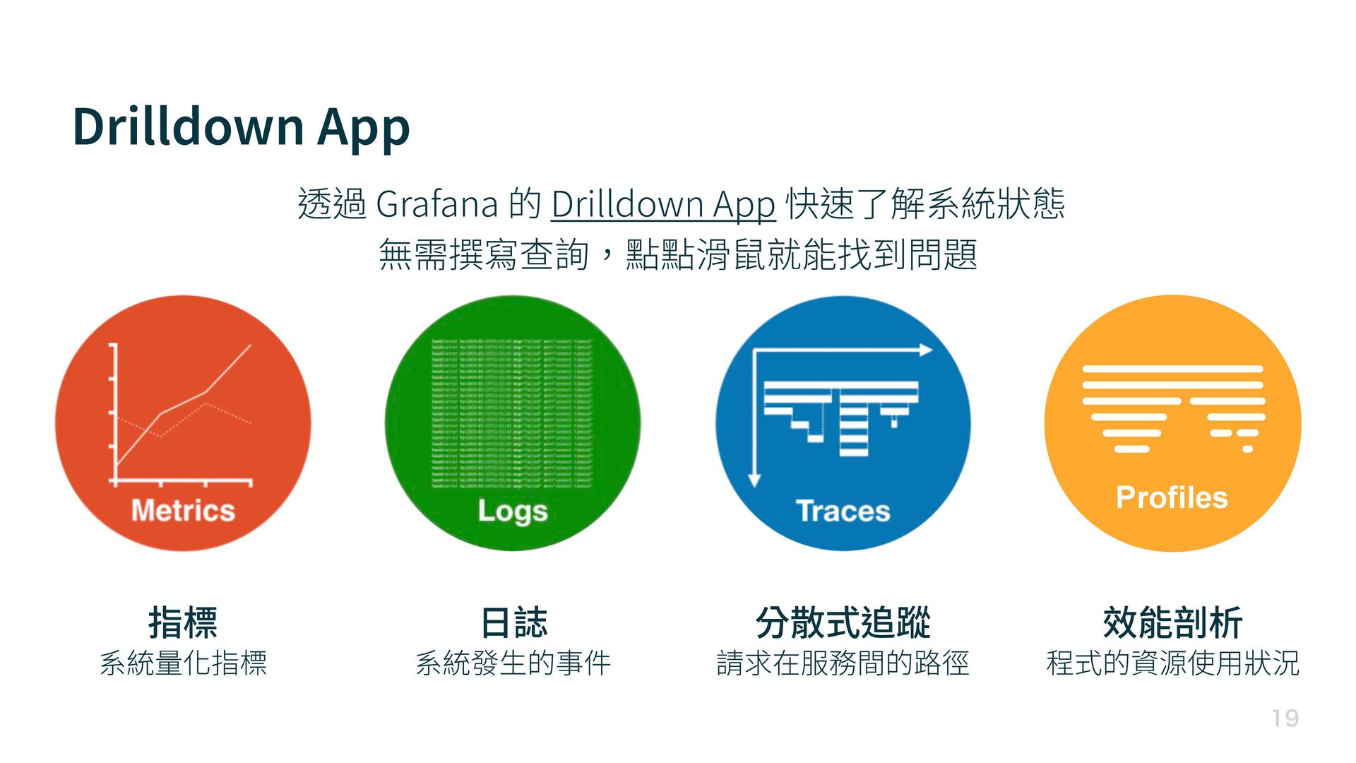 的事件 分散式追蹤 請求在服務間的路徑 效能剖析 程式的資源使 用 狀況 透過 Grafana 的 Drilldown App 快速了解系統狀態 無需撰寫查詢,點點滑 鼠 就能找到問題