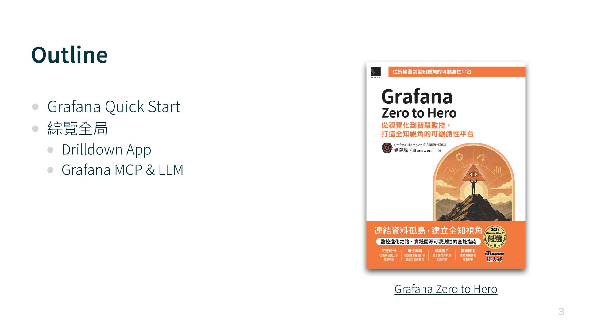 本次分享將介紹如何快速上手 Grafana,並透過 Drilldown 與 MCP 讓你在沒有相關工具背景下也能縱覽系統全局。