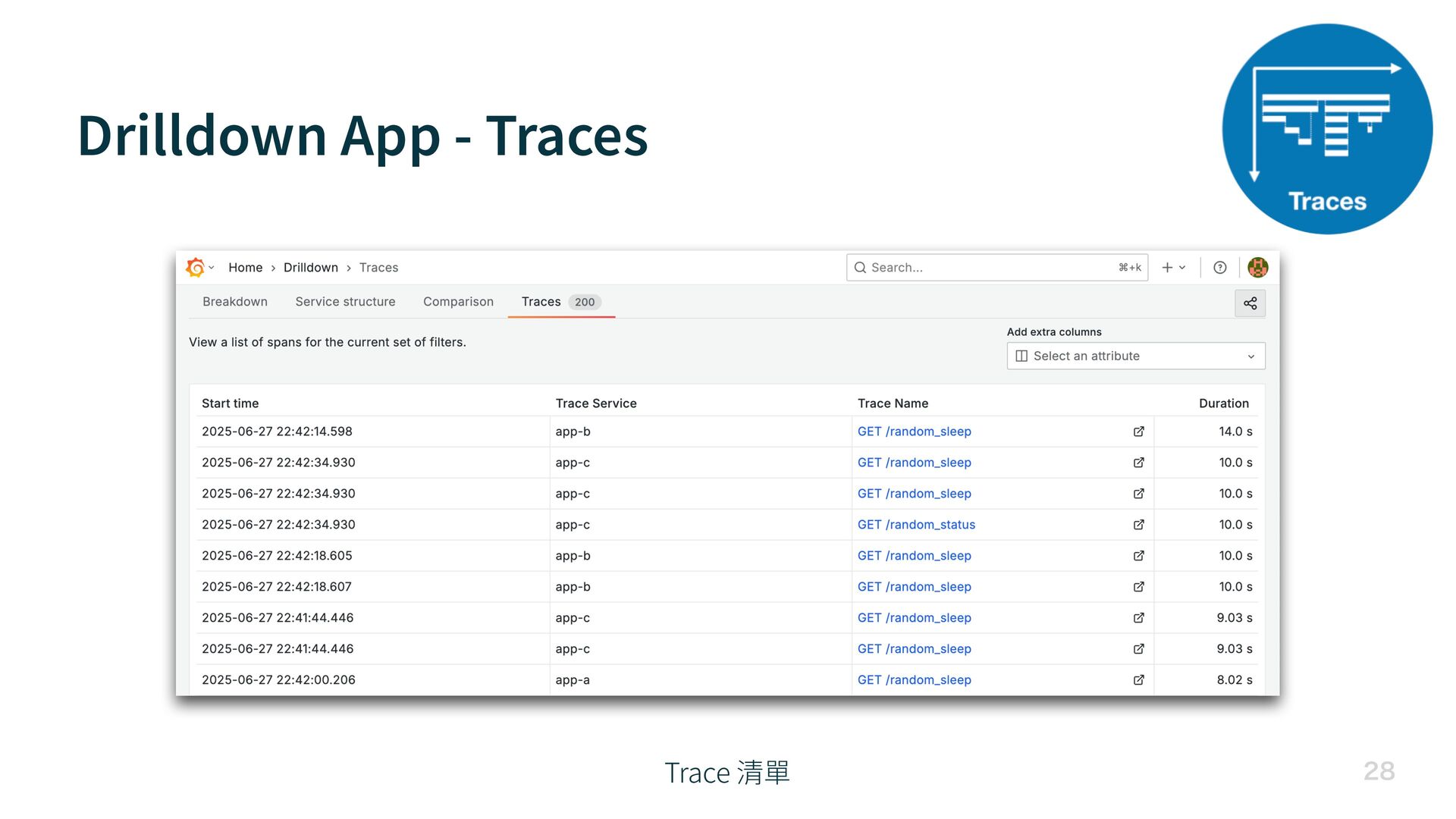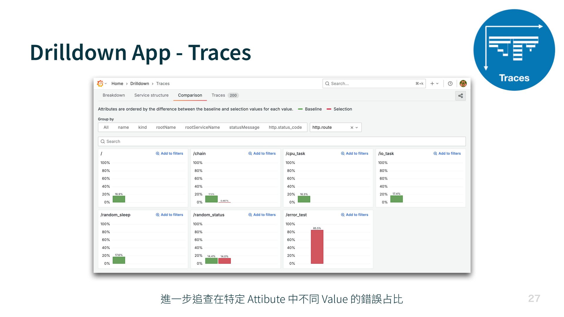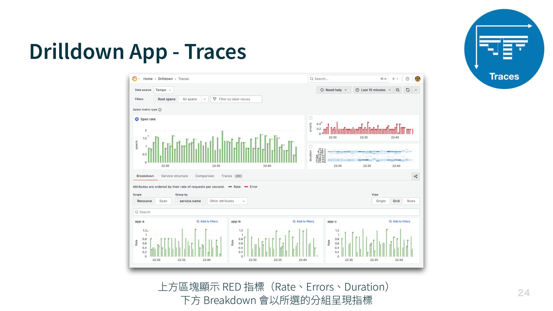 指標(Rate、Errors、Duration) 下 方 Breakdown 會以所選的分組呈現指標