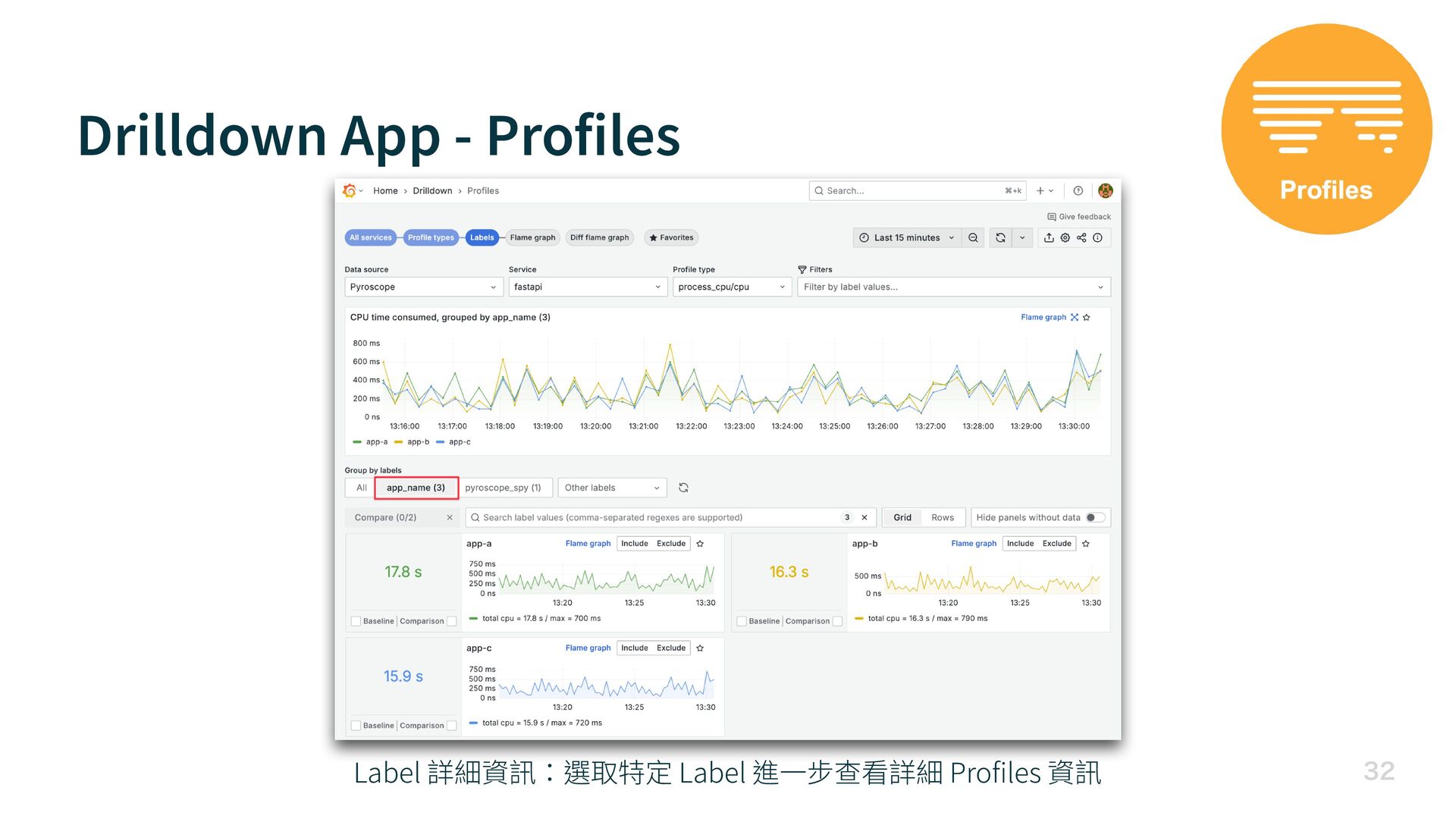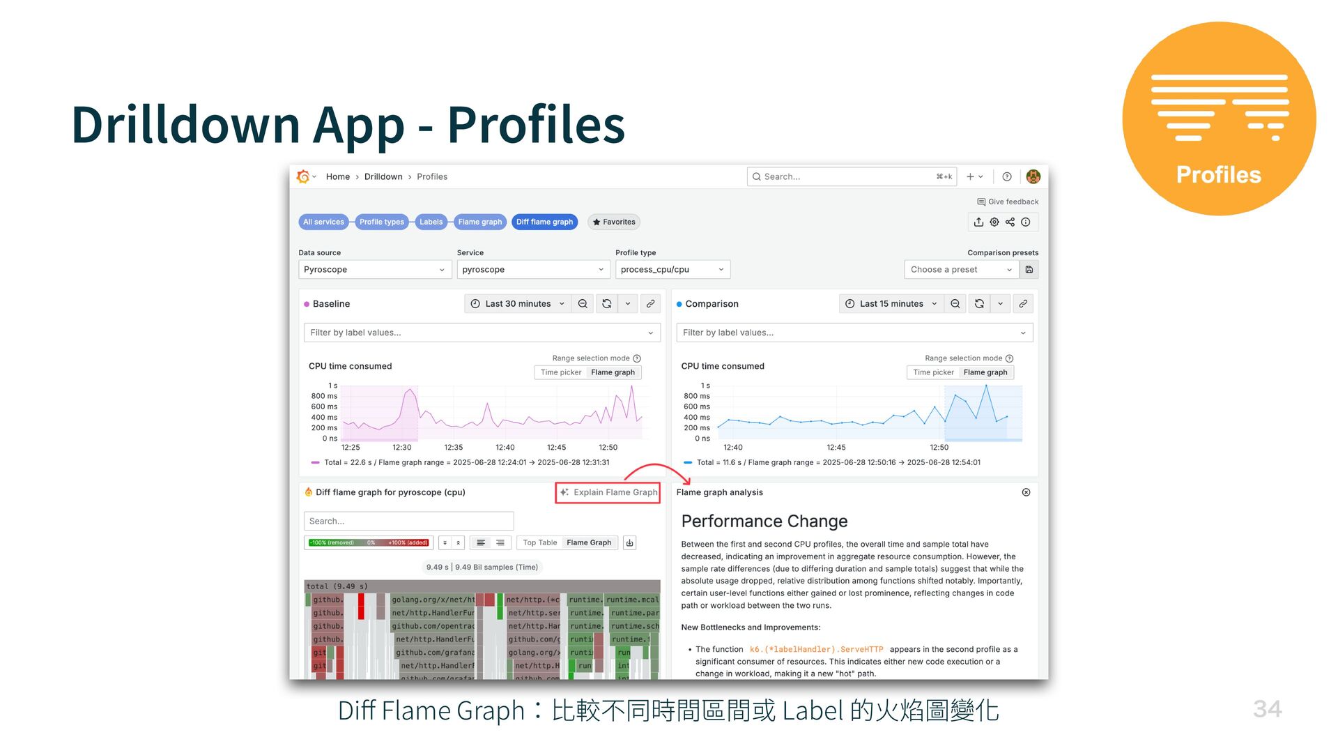Graph: 比 較不同時間區間或 Label 的 火 焰圖變化