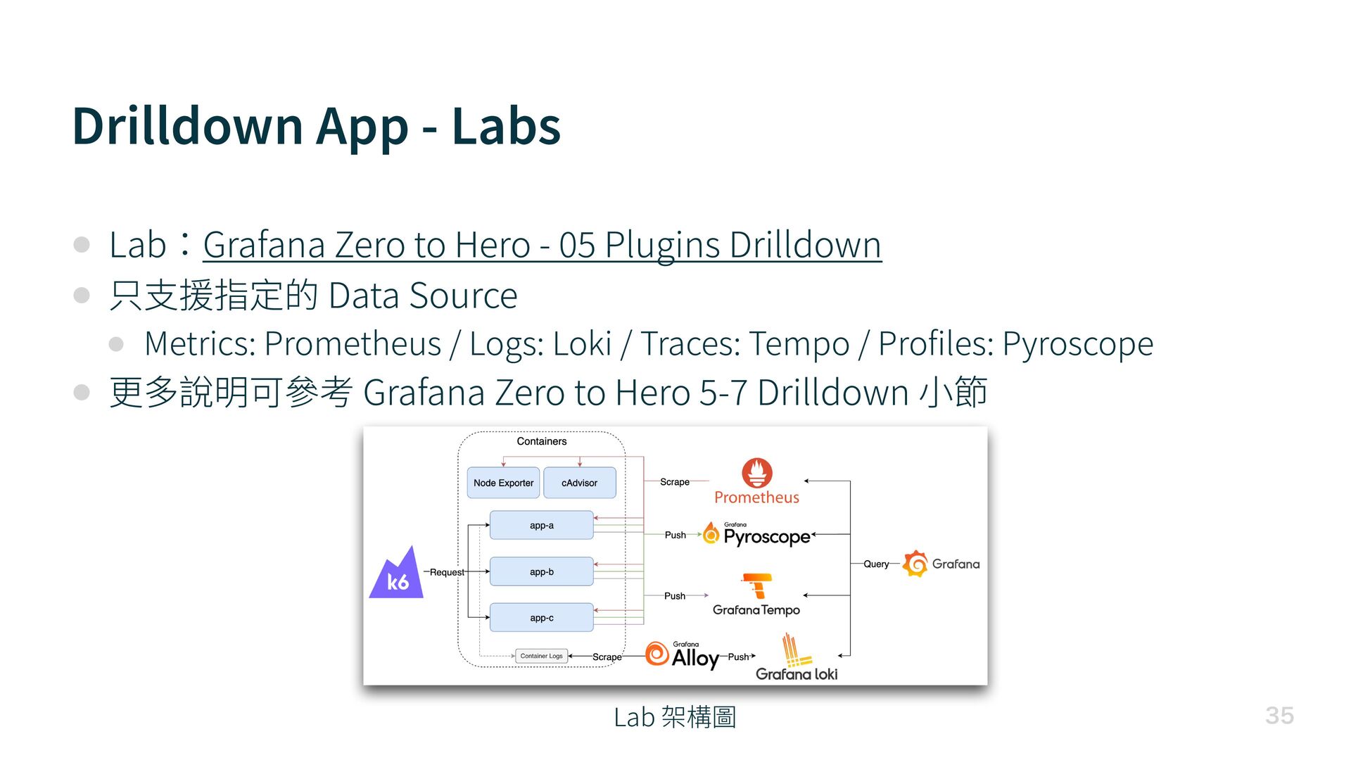 - 0 5 Plugins Drilldown • 只 支 援指定的 Data Source • Metrics: Prometheus / Logs: Loki / Traces: Tempo / Pro fi les: Pyroscope • 更多說明可參考 Grafana Zero to Hero 5 - 7 Drilldown 小 節 Lab 架構圖
