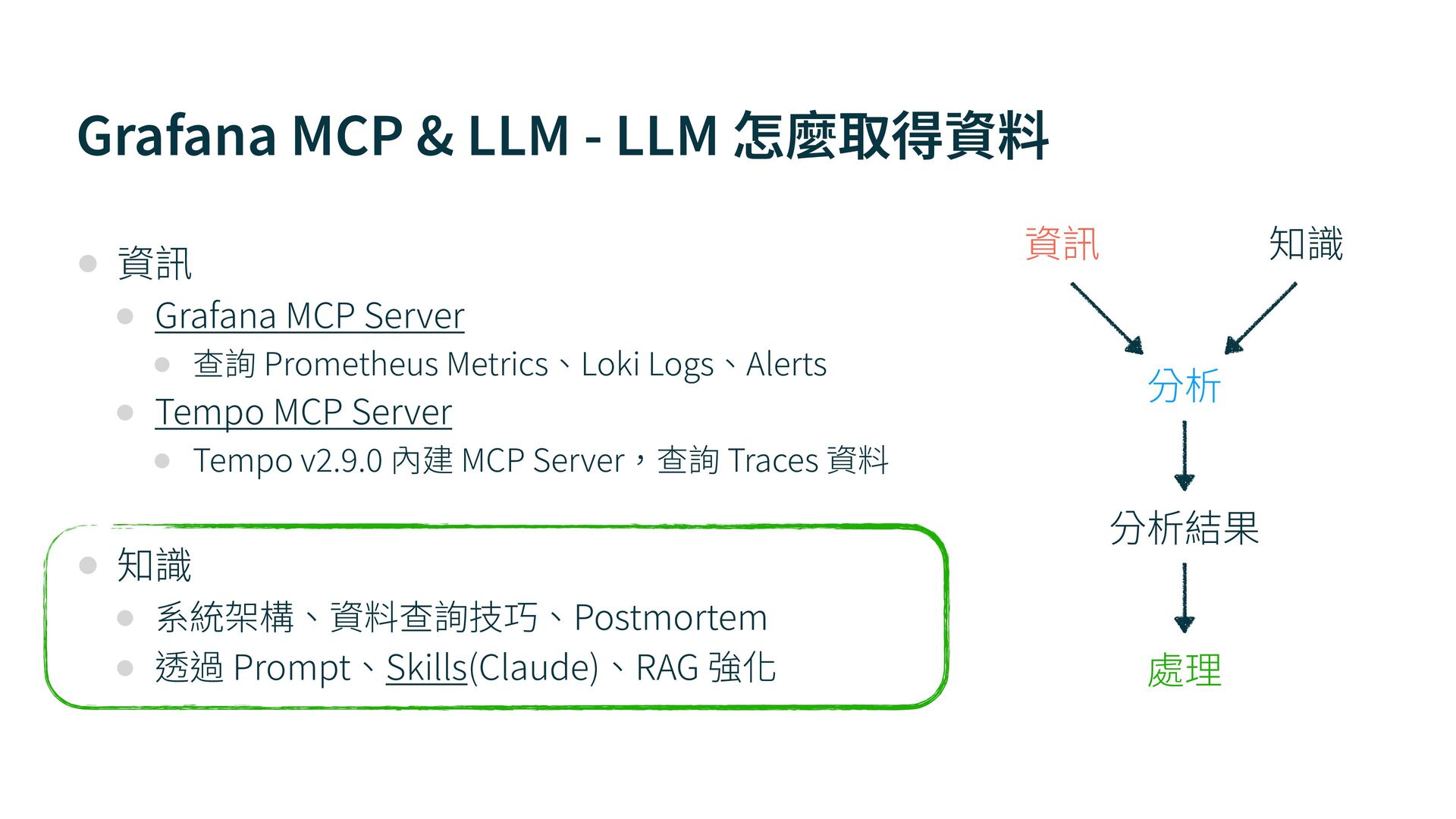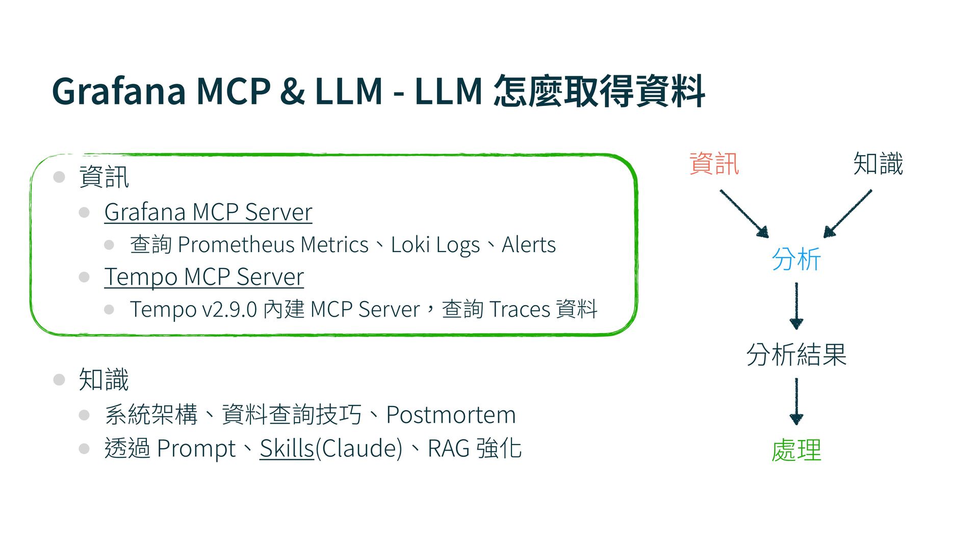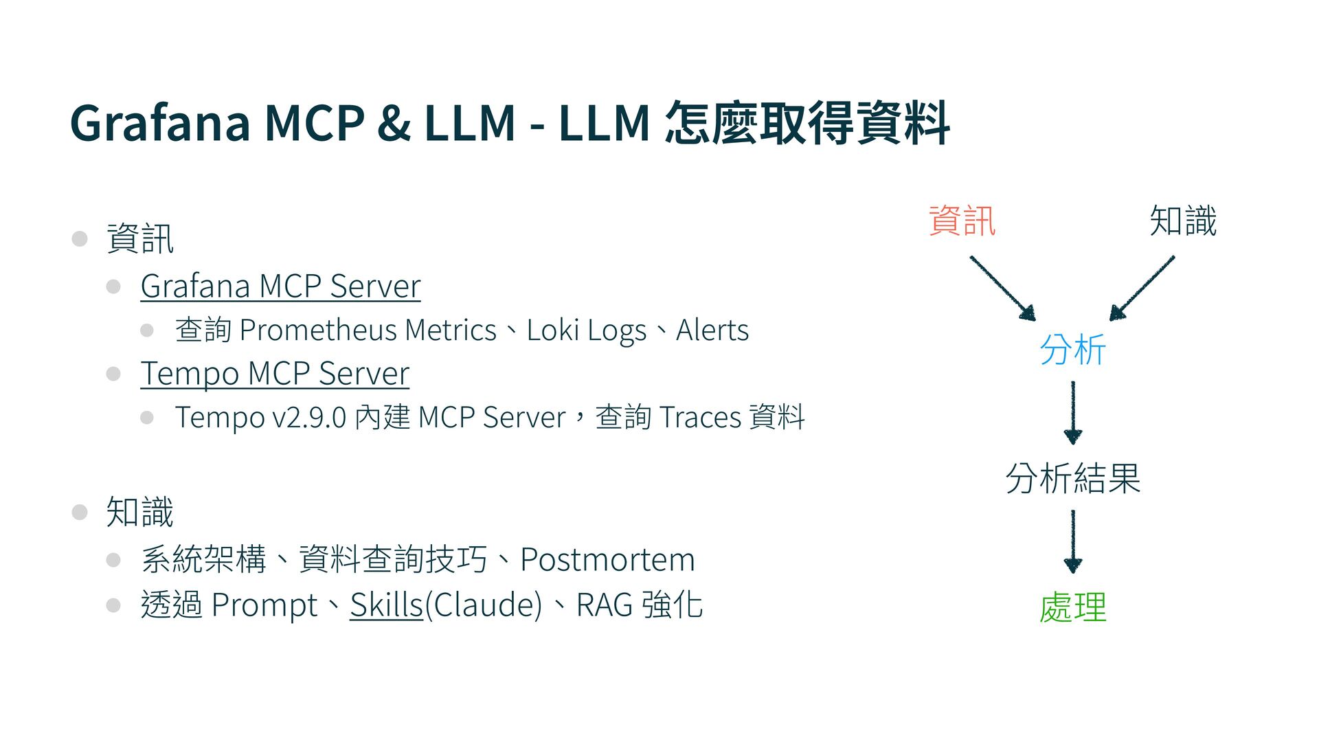 Grafana MCP Server • 查詢 Prometheus Metrics、Loki Logs、Alerts • Tempo MCP Server • Tempo v 2 . 9 . 0 內建 MCP Server,查詢 Traces 資料 • 知識 • 系統架構、資料查詢技巧、Postmortem • 透過 Prompt、Skills(Claude)、RAG 強化 分析 處理 分析結果 資訊 知識
