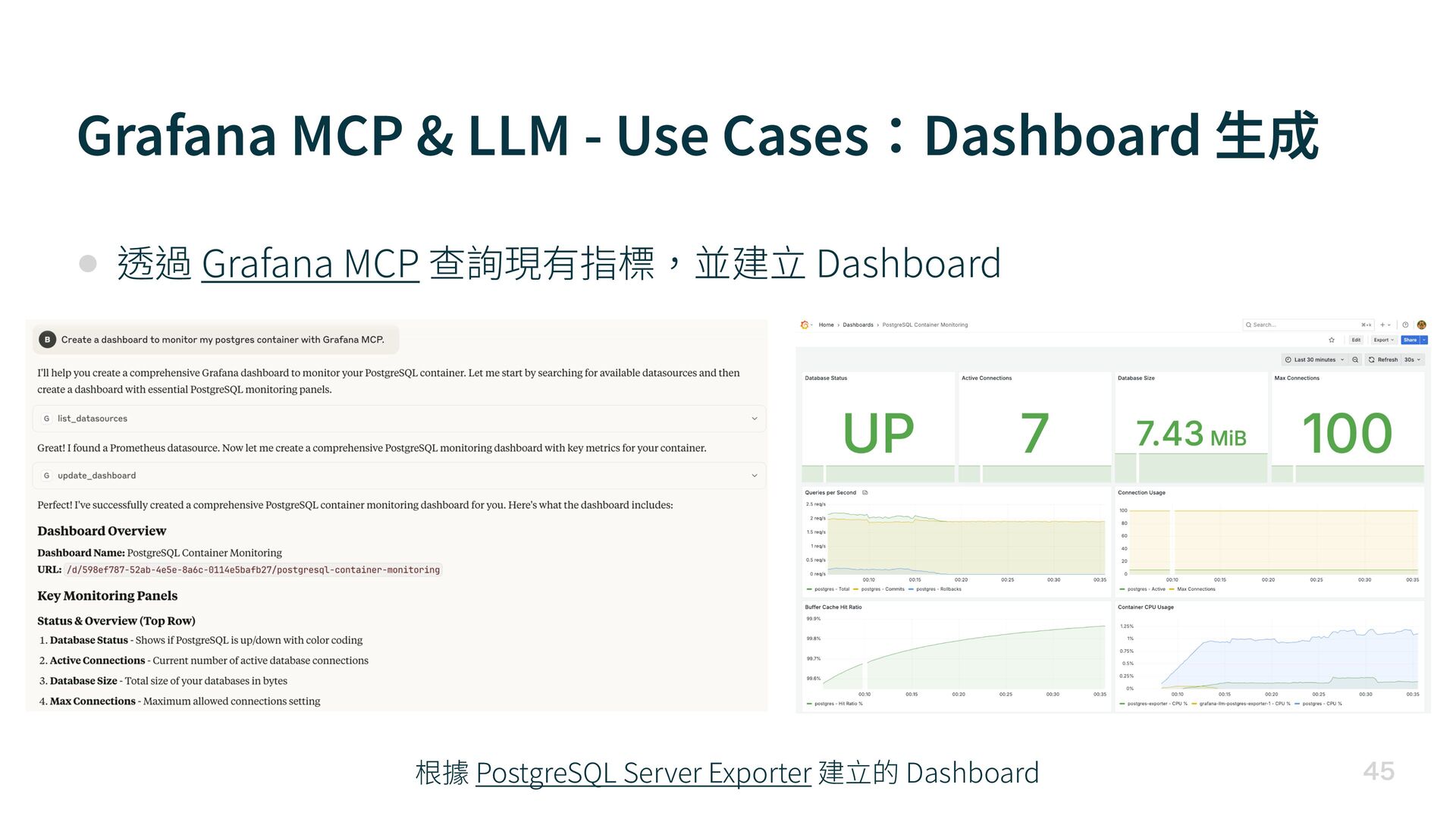 • 透過 Grafana MCP 查詢現有指標,並建 立 Dashboard 根據 PostgreSQL Server Exporter 建 立 的 Dashboard
