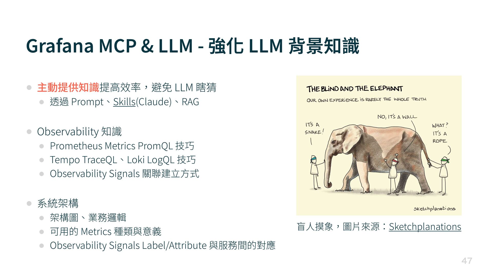 主動提供知識提 高 效率,避免 LLM 瞎猜 • 透過 Prompt、Skills(Claude)、RAG • Observability 知識 • Prometheus Metrics PromQL 技巧 • Tempo TraceQL、Loki LogQL 技巧 • Observability Signals 關聯建 立 方 式 • 系統架構 • 架構圖、業務邏輯 • 可 用 的 Metrics 種類與意義 • Observability Signals Label/Attribute 與服務間的對應 盲 人 摸象,圖 片 來源:Sketchplanations