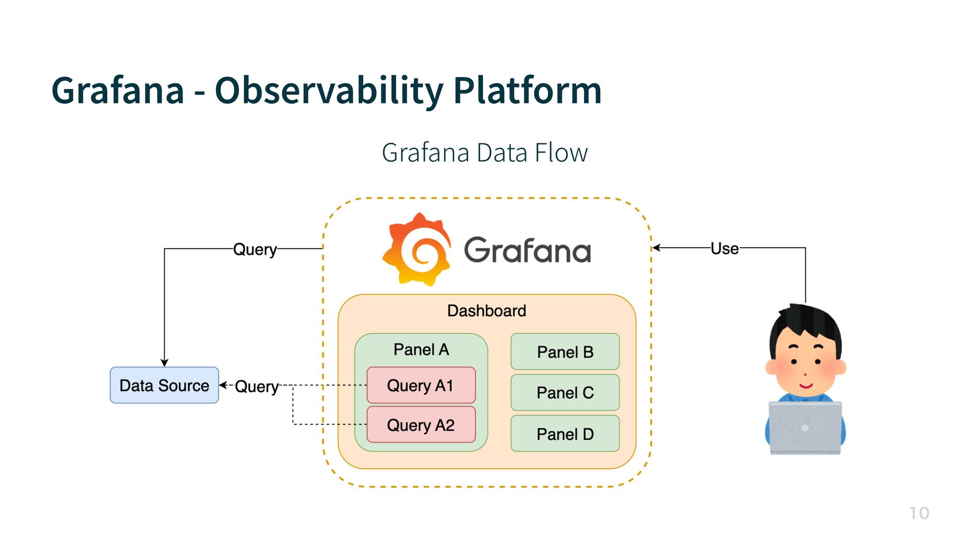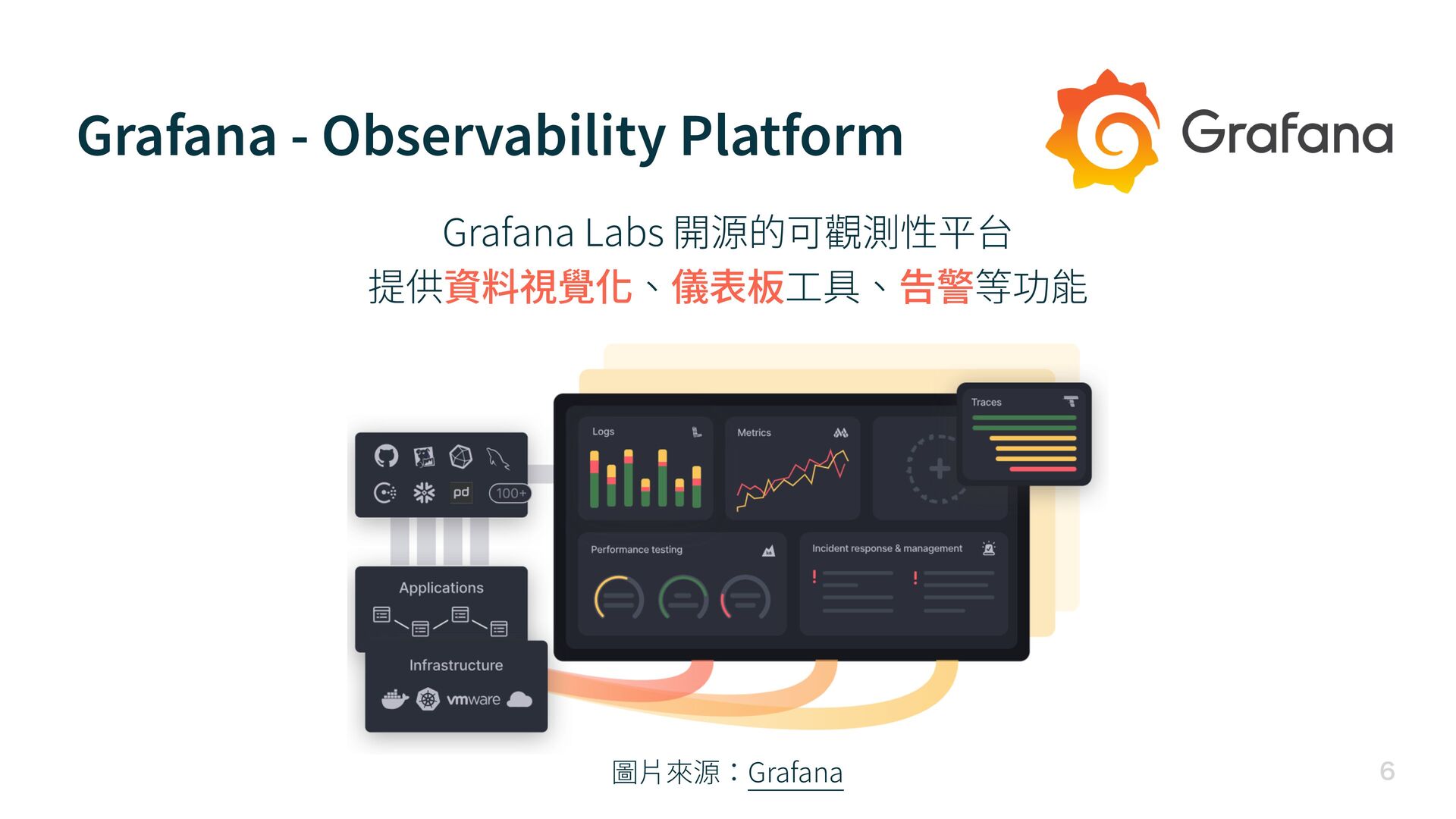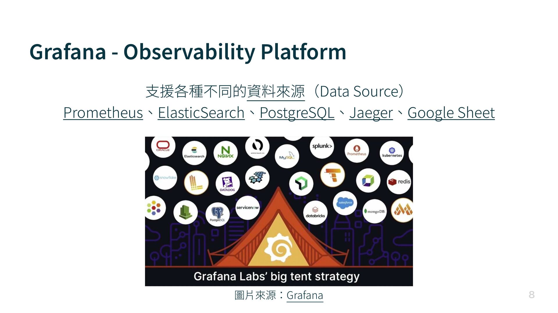4. Grafana - Observability Platform  圖 片 來源:Grafana 支 援各種不同的資料來源(Data